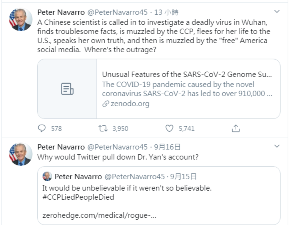 納瓦羅推文:「一位中國科學家調查武漢出現的致命病毒,發現惱人的事實,被中共禁止發聲後為了保命,逃到美國,想說出真相,現在卻被『自由』的美國社交媒體噤聲,『有話直說』到哪裡去了?」