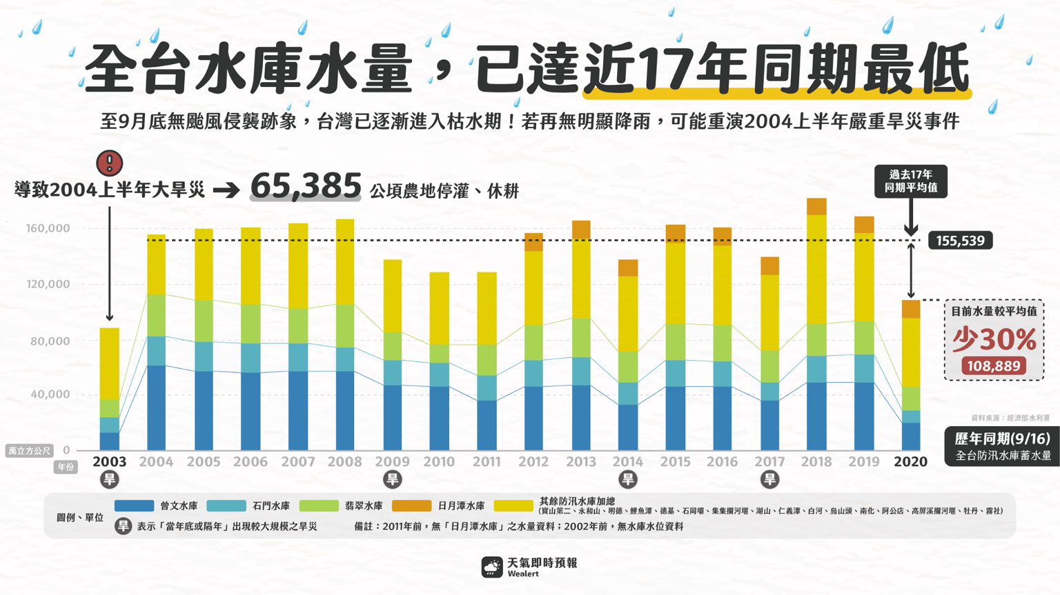 粉絲專頁「天氣即時預報」統計,2003年至2020年每年9月16日的防汛重點水庫蓄水量,發現今年水庫蓄水量創下17年來最低,且比過去17年的平均少了3成,並指出日月潭水庫2012年才有水量資料,因此若扣除後,今年水情幾乎與2003年一樣險峻。