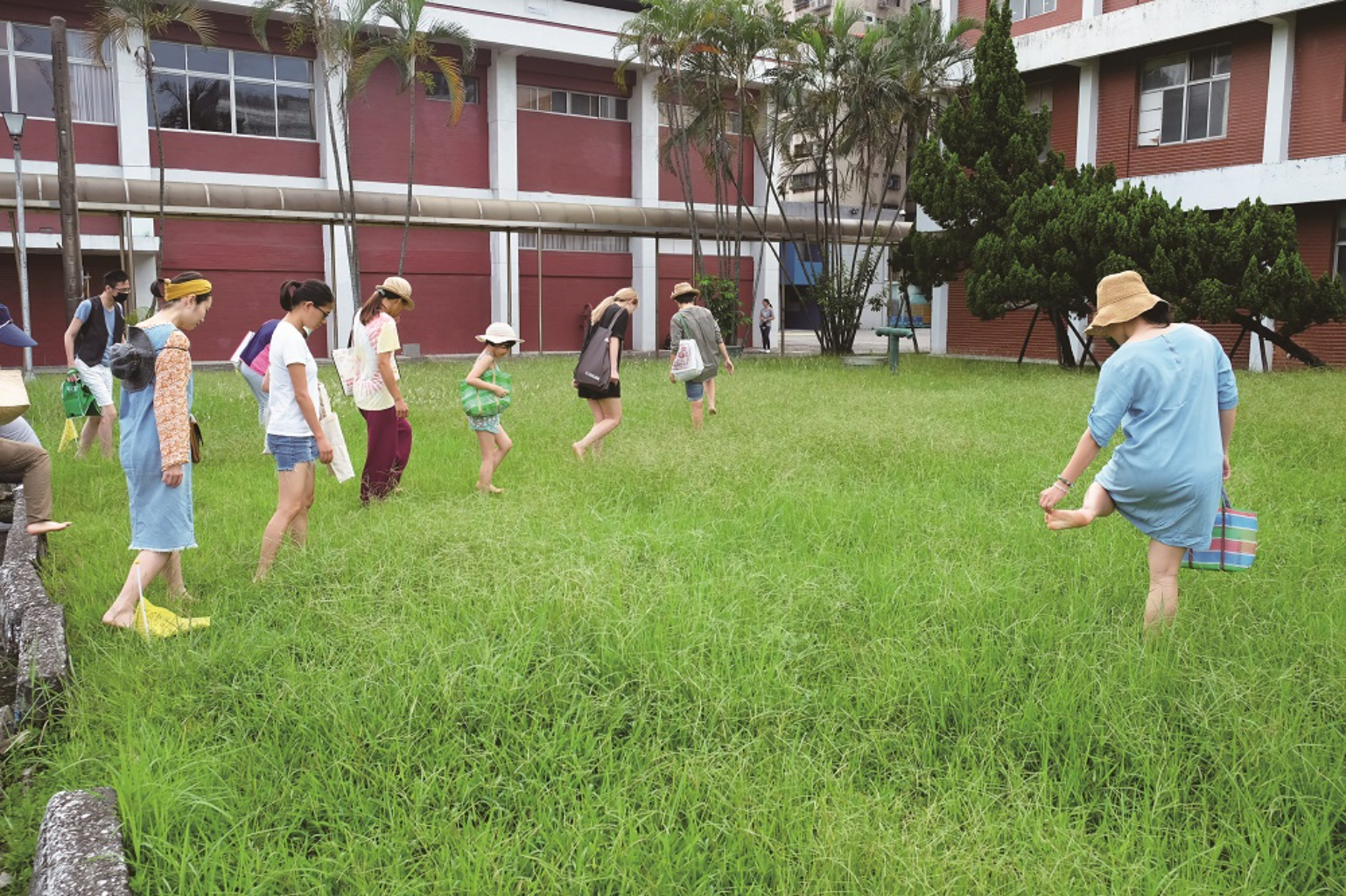 然而,城市裡的雜草是否安全可食?「雜草或許比我們吃的蔬菜,更沒有農藥吧。」賴瑋婷指著公園綠地上的一株牛筋草,解釋頂端的部分即能為人所用,她轉身又拾起榕樹樹幹旁、一般會被清掉的氣根,單獨放進嘴裡嚼嚼,「是不是帶一點椰香?」對初接觸雜草的體驗者而言,不確定是否安全的草株,她們建議還是以觀察為主。