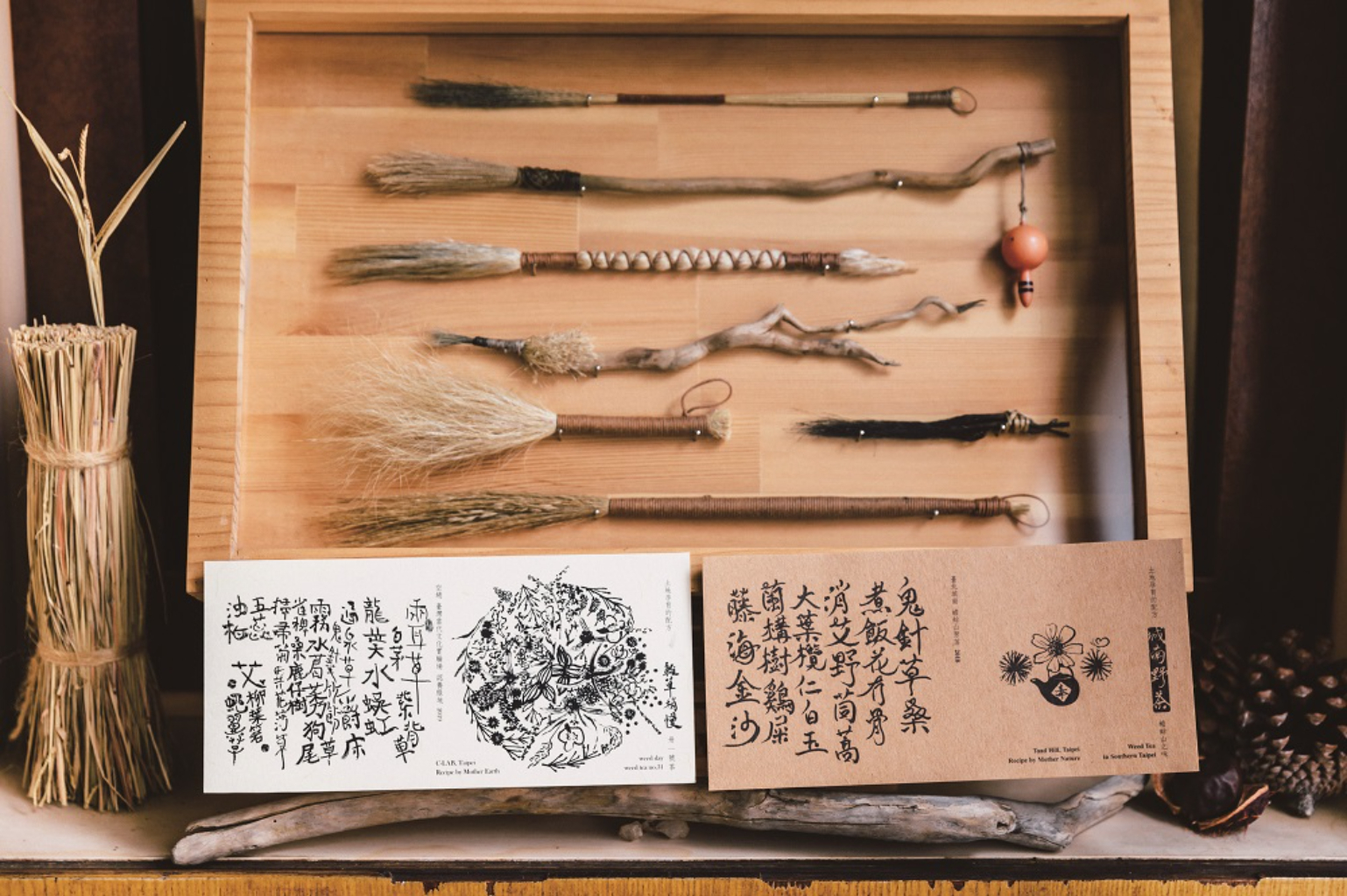 兩人會採集類似茅草、枝稈較為硬挺的雜草,綑紮成雜草筆。運用這樣的雜草筆寫下每一次採集的雜草名,並透過書法般的筆觸,繪出每一次採集到的雜草,便形成獨一無二的雜草曼陀羅畫,以繪畫為每一款雜草茶注入專屬的靈魂。