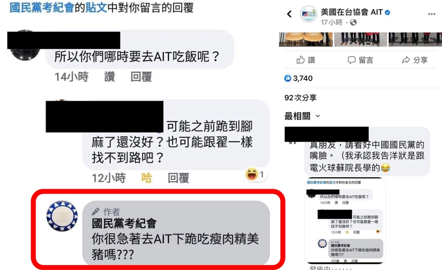 自從國民黨暫拒赴美國在台協會(AIT)午宴之後,其對美關係格外引人注目。儘管黨主席江啟臣堅稱「親美和中」路線,但顯然難以貫徹全黨。國民黨考紀會官方臉書今(22)日就怒嗆網友「你很急著去AIT下跪吃瘦肉精美豬嗎?」結果遭網友截圖向AIT檢舉告洋狀。