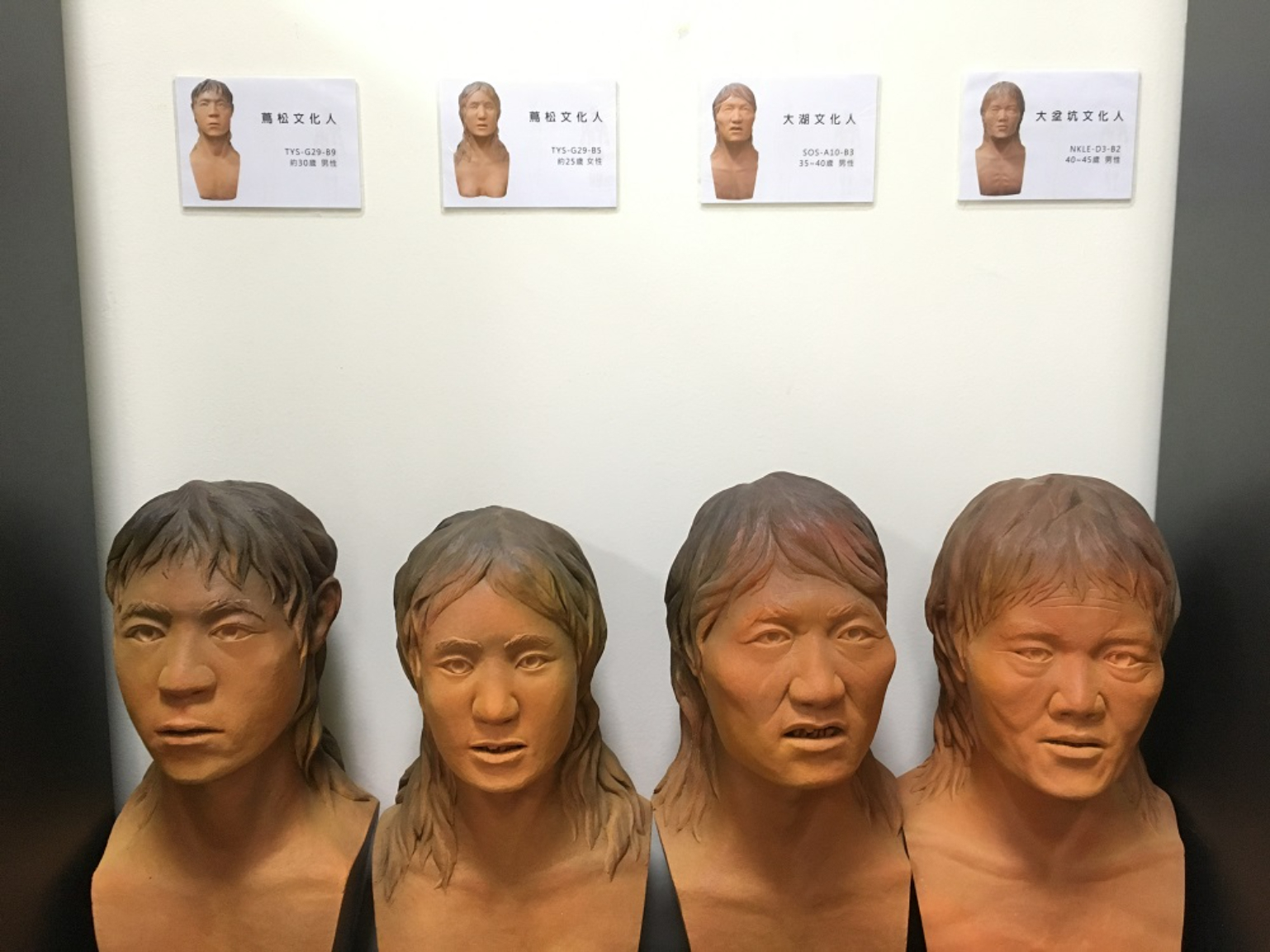 李匡悌指著頭像說明:「左邊這兩人頭型較小、是典型南方臉孔,右邊這兩人是北方挺拔粗獷的輪廓。這些都是在南科遺址出土的頭骨,可以看到史前的人來人往。」