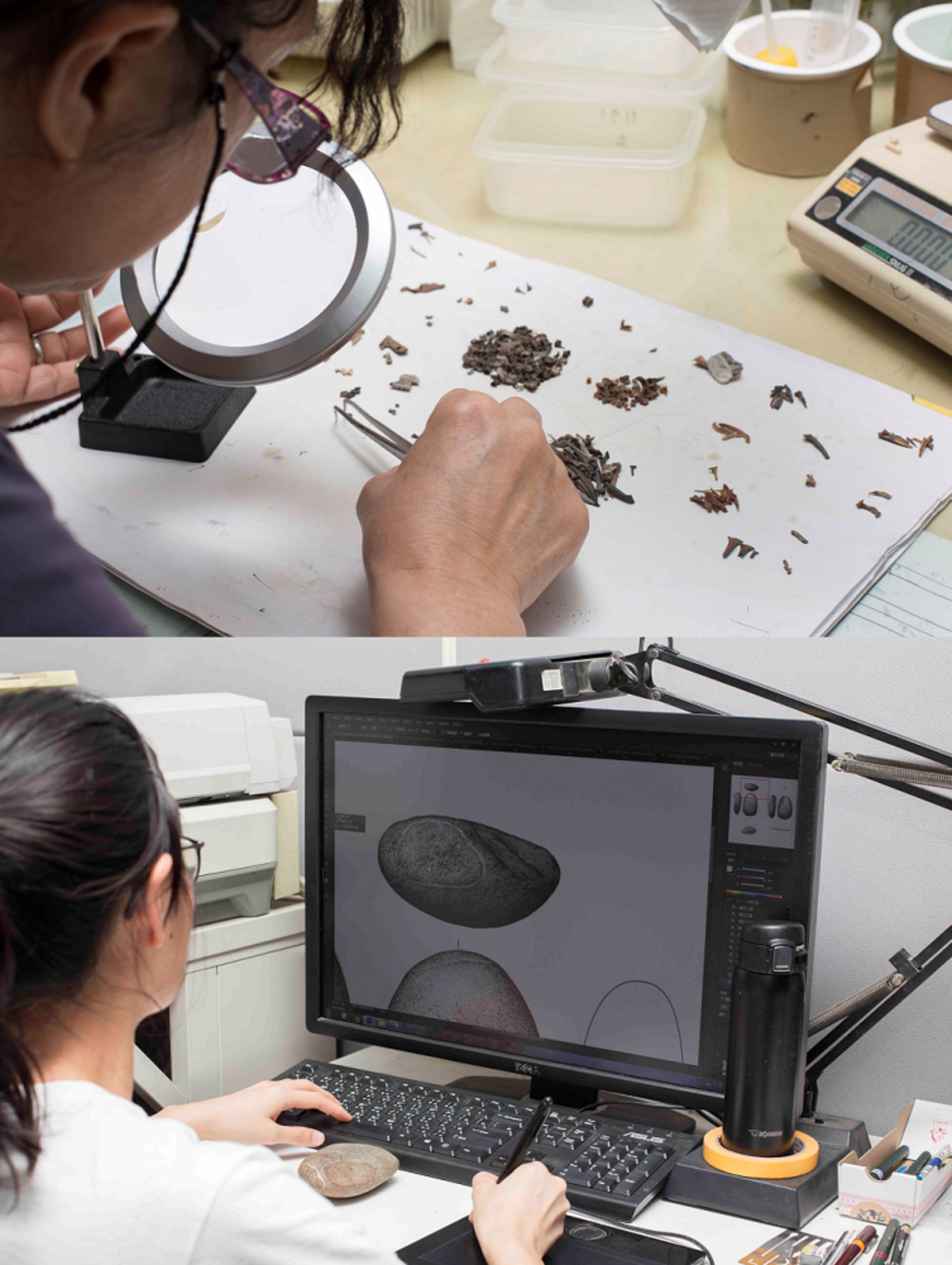 至於史前住民製作的文化遺物出土後,例如石器、陶器,會來到「繪圖室」描繪紀錄。先測量遺物的口徑、剖面、厚度,也會分析製作方法與接合點,再拍攝、點描、彩繪並完稿。