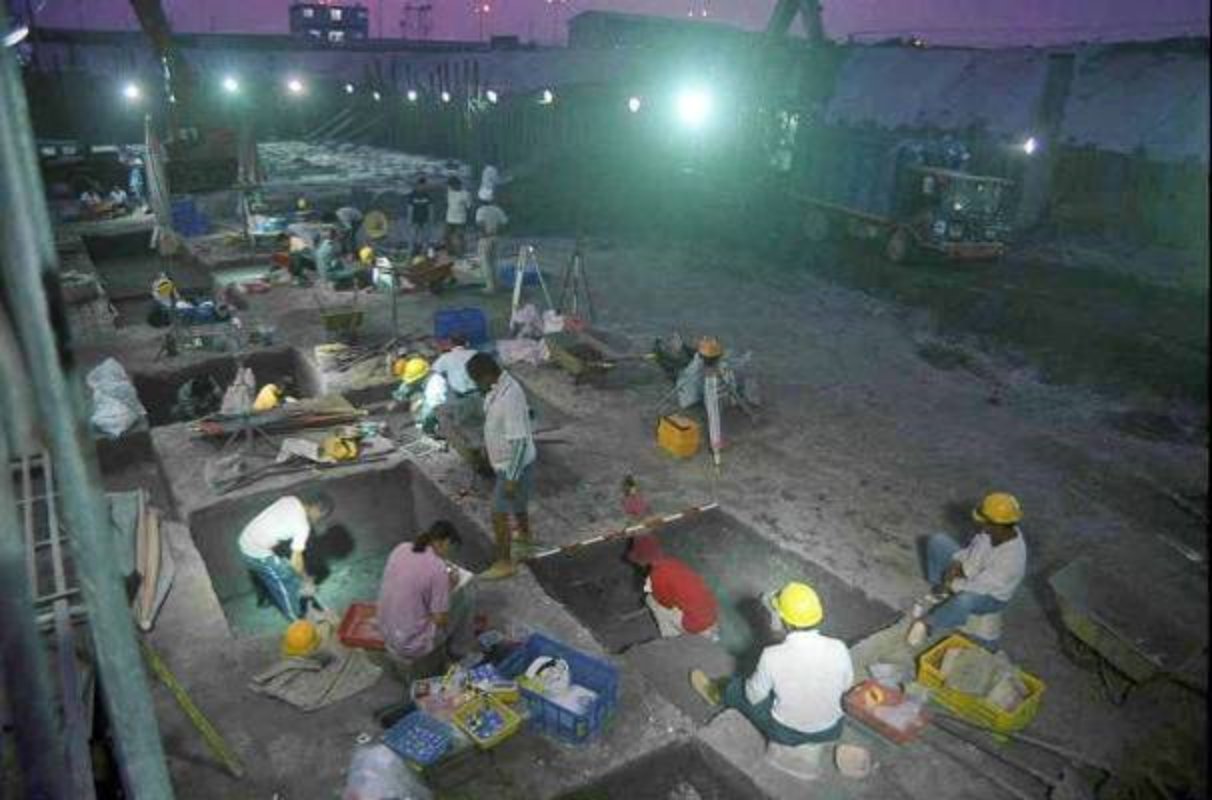 怪手、卡車、鑽岩芯機轟隆隆開挖基地,塵土飛揚不遠處,一群來自中研院、臺灣史前文化博物館的南科考古團隊,蹲在一個個方坑中,小心翼翼地拿著小鏟,一層層挖掘長埋地下的文物。工作人手從個位數,逐漸增加到一兩百人。