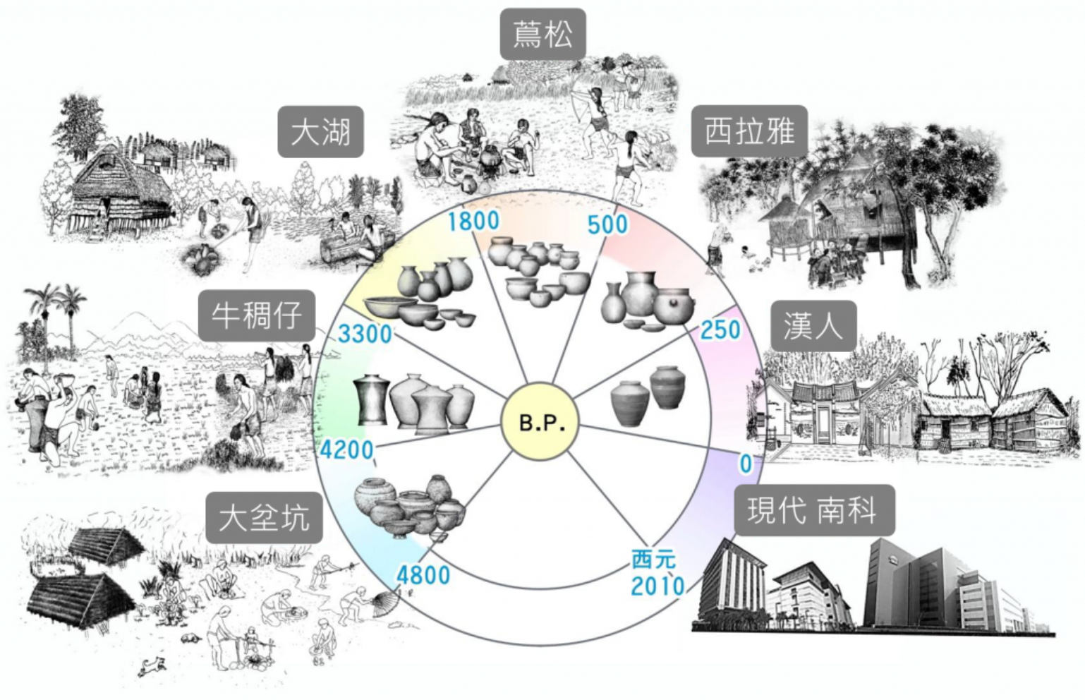 至今南科共發現 68 處遺址,比對出土層順序、遺物遺跡的類型風格,結合放射性碳 14 的年代測定,可以辨識出六個時期文化:最早到達的先民「大坌坑文化」,落地生根的「牛稠子文化」,新來的人群「大湖文化」,使用鐵器的「蔦松文化」,平埔族的祖先「西拉雅文化」,以及唐山過臺灣的「漢人文化」。