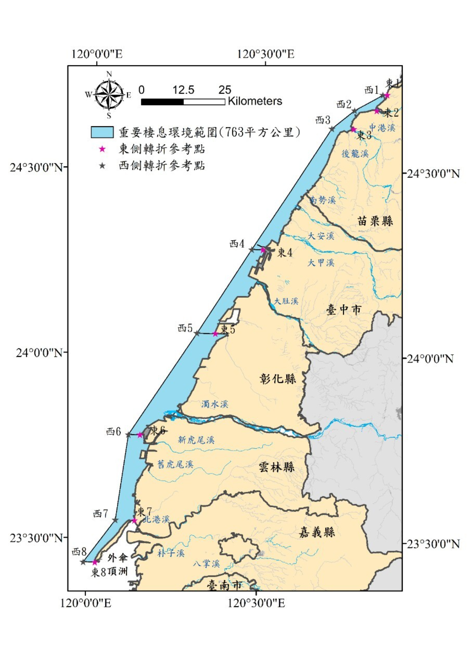 海保署劃出中華白海豚重要棲息環境範圍,北起苗栗縣龍鳳港以北的森林公園沙灘,南邊界線為外傘頂洲西南端,西邊界線依中華白海豚在各區活動範圍不同而以海岸線距岸1至3浬為基礎劃直斜線,東邊界線為海岸線距岸50公尺處,並包括主要河口在內。白海豚的重要棲息環境在苗栗、臺中、彰化、雲林等直轄市及縣市內,面積有763平方公里。