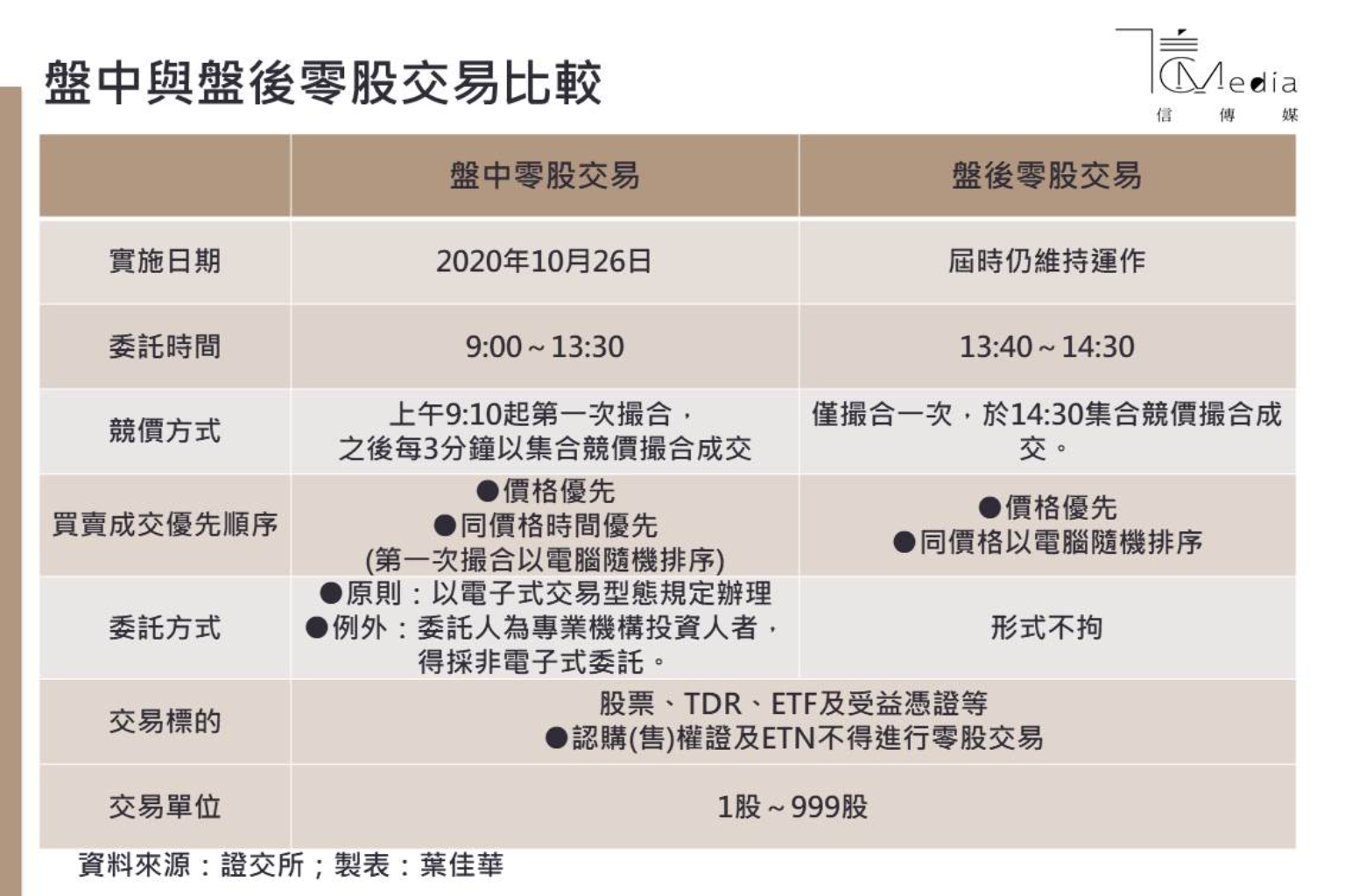 因此為了讓投資人可以更方便地參與台股,證交所則修訂上市股票零股交易辦法,新增零股交易買賣申報時間為上午9:00至下午1:30,而既有的盤後零股交易也維持運行。也就是說,從10月26日起,投資人從開盤(早上9點)到收盤(13點30分)也可以委託買賣零股。