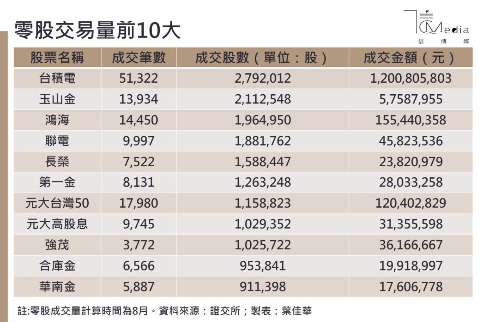 那麼以往哪些零股交易標的最受投資人青睞?以今年8月一整個月來看盤後的零股交易量統計,晶圓代工龍頭台積電(2330)居於成交股數之冠,以279萬股贏過玉山金,其次玉山金則以211萬股位居第2名,第3名則是鴻海,成交股數約196萬股。