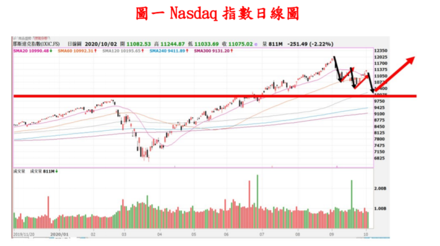 如以 Nasdaq 指數為例來說,即使10月初仍有回測的可能,惟預期在美國總統大選前應該不至於大跌且跌破萬點關卡,甚至近期作完修正,仍有可能再往上 漲(創新高)或是反彈(不過新高),如下圖一 Nasdaq 指數日線圖所示。而其預估走勢,是以上述情境一的分析做假設,暫時撇除第三種的可能性。
