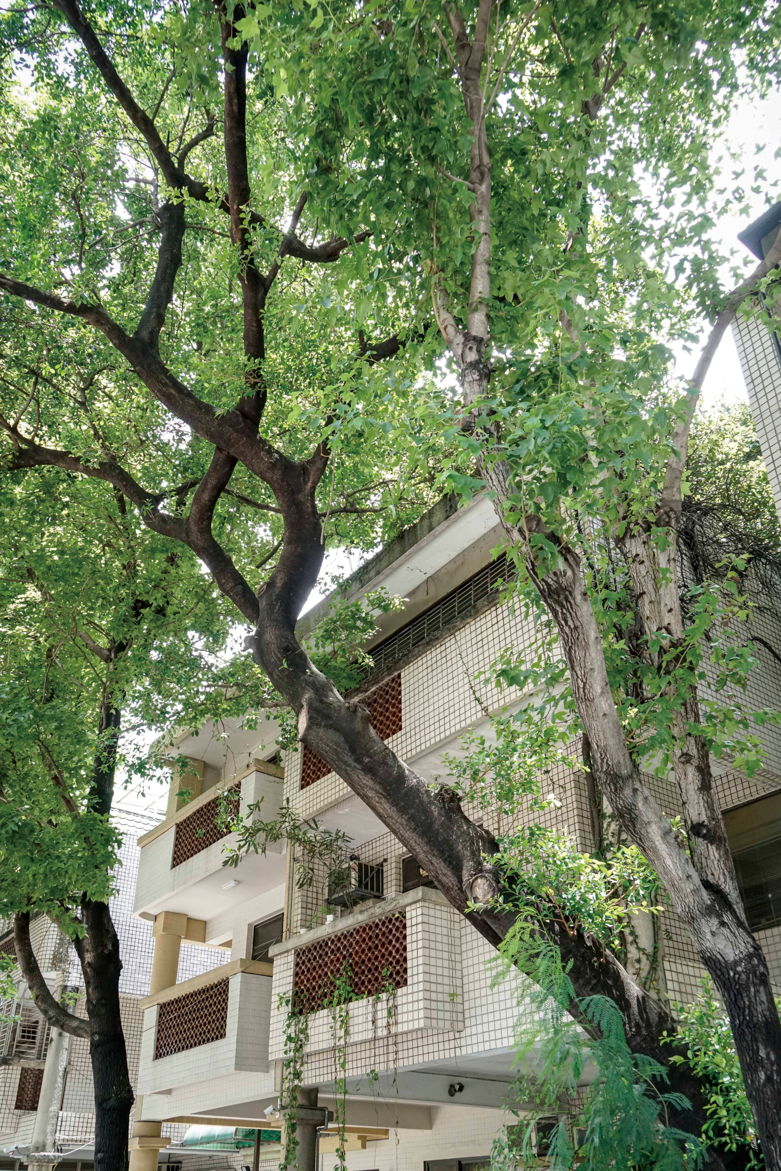 門前一整排楓香,是搬來時申請種植的行道樹,還有株20多年的老榕,樹蔭開闊濃密,陳玉峯說起以前覆蓋面積最廣時還曾擴及到路中央。他印象最深的是每到盛夏,就有許多人「不請自來」,像是有對開著小發財車的父子, 賣菜前都會先把車子停在這裡,拿塊木板就地小憩,或是附近送瓦斯的、做餐飲外送的,也經常停在這裡乘涼, 「大清早還有人在這裡做體操呢!」