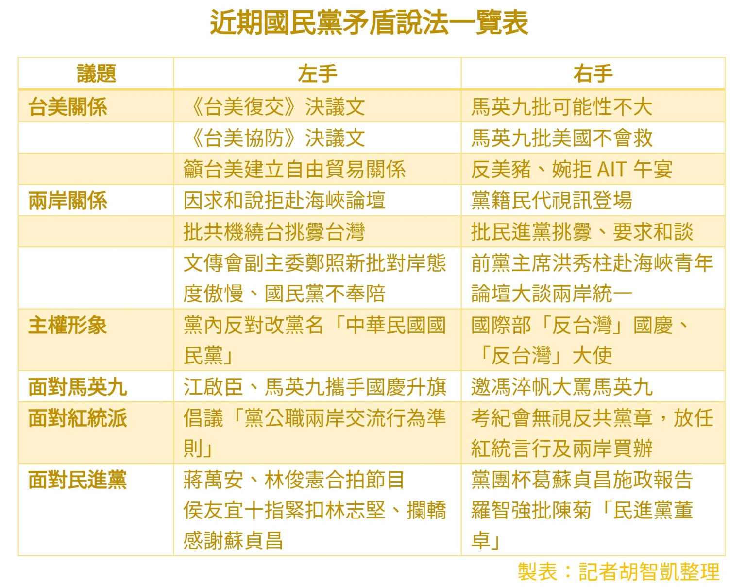 國民黨長期以來人多口雜,黨中央有本土派、親中派之爭,基層亦有地方派系之爭,近期全黨上下更是大鳴大放,既說要撕去「親中賣台」標籤,但卻差點赴海峽論壇「求和」;又說要「親美反共」,但卻藉口英文不好婉拒AIT午宴。