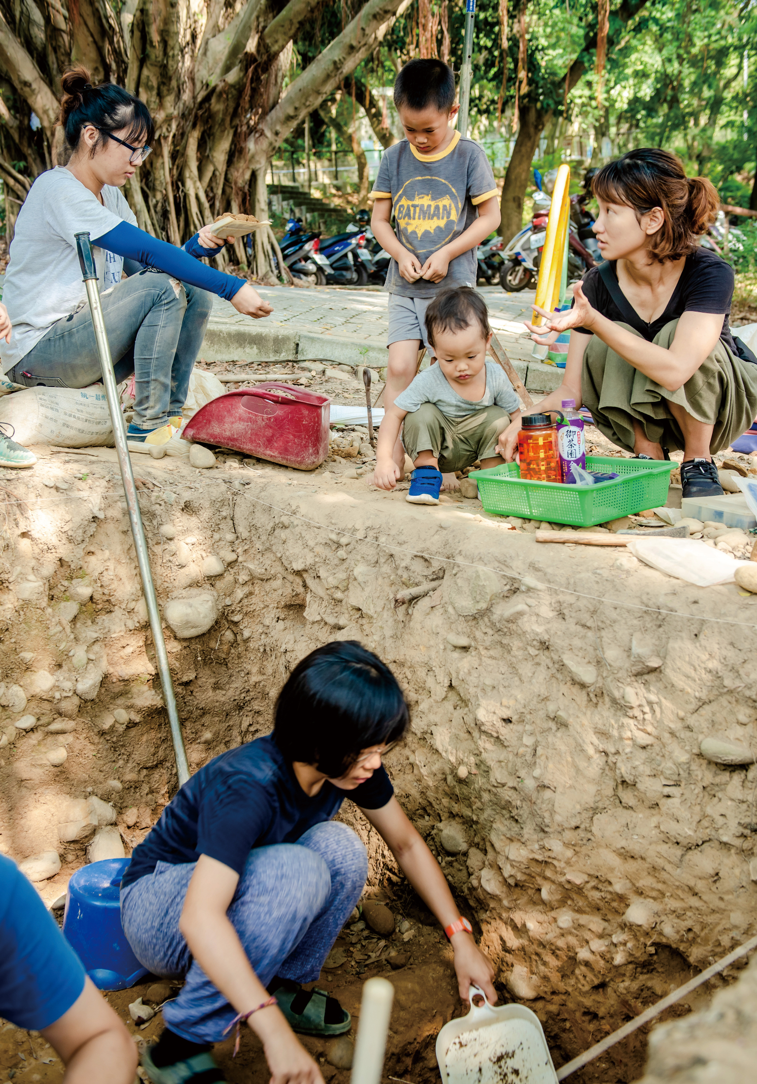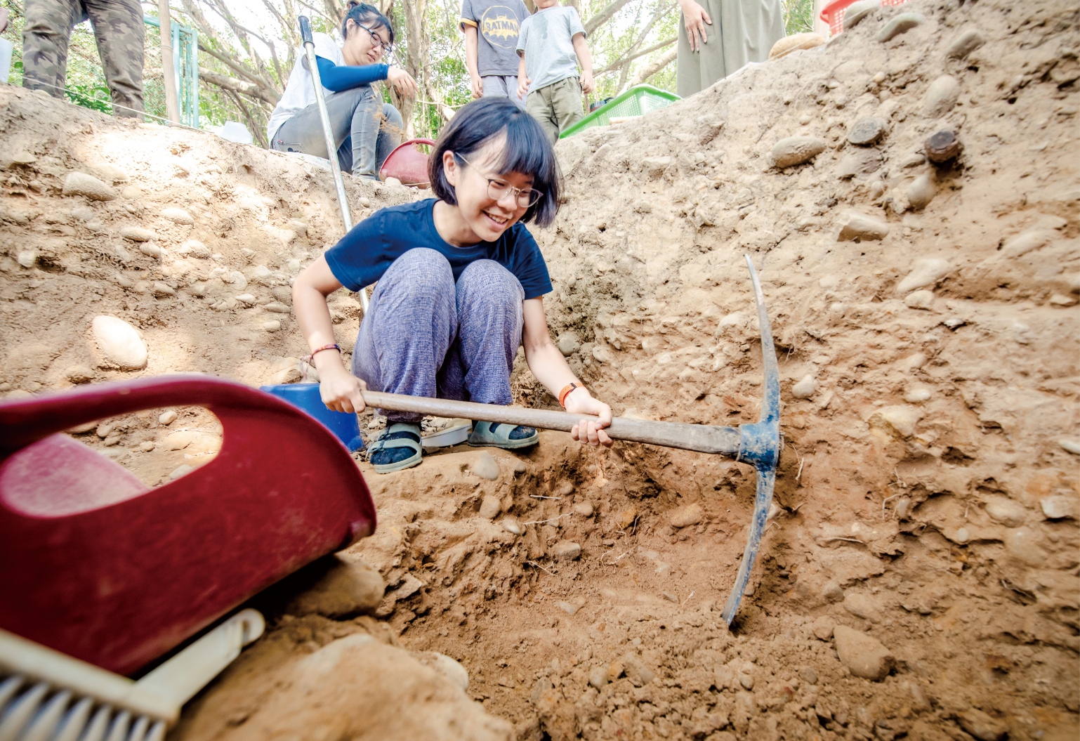 提到考古的第一步,江芝華說,擇定發掘點位相當重要。江芝華指著全齡友善步道旁的邊坡說,「當時就是在這個斜坡面看到陶片露出,讓我更篤定這個坑位應該能發現一些東西。」一旦確定坑位後,會先圈出1或2平方公尺的挖掘範圍,開始用小鏟子一層層向下開挖。江芝華解釋,土層最上層的「近代耕作層」是最接近現代人的活動面,會受到近代氣候和人類活動影響,往下開挖就會來到「早期文化層」,絕大部分的考古文物都是出自於此,發掘工作也會更細膩小心避免破壞,除了土壤會一一裝袋收集外,發現碳粒、陶片、石器等也都會一一編號紀錄,以利後續的研究。