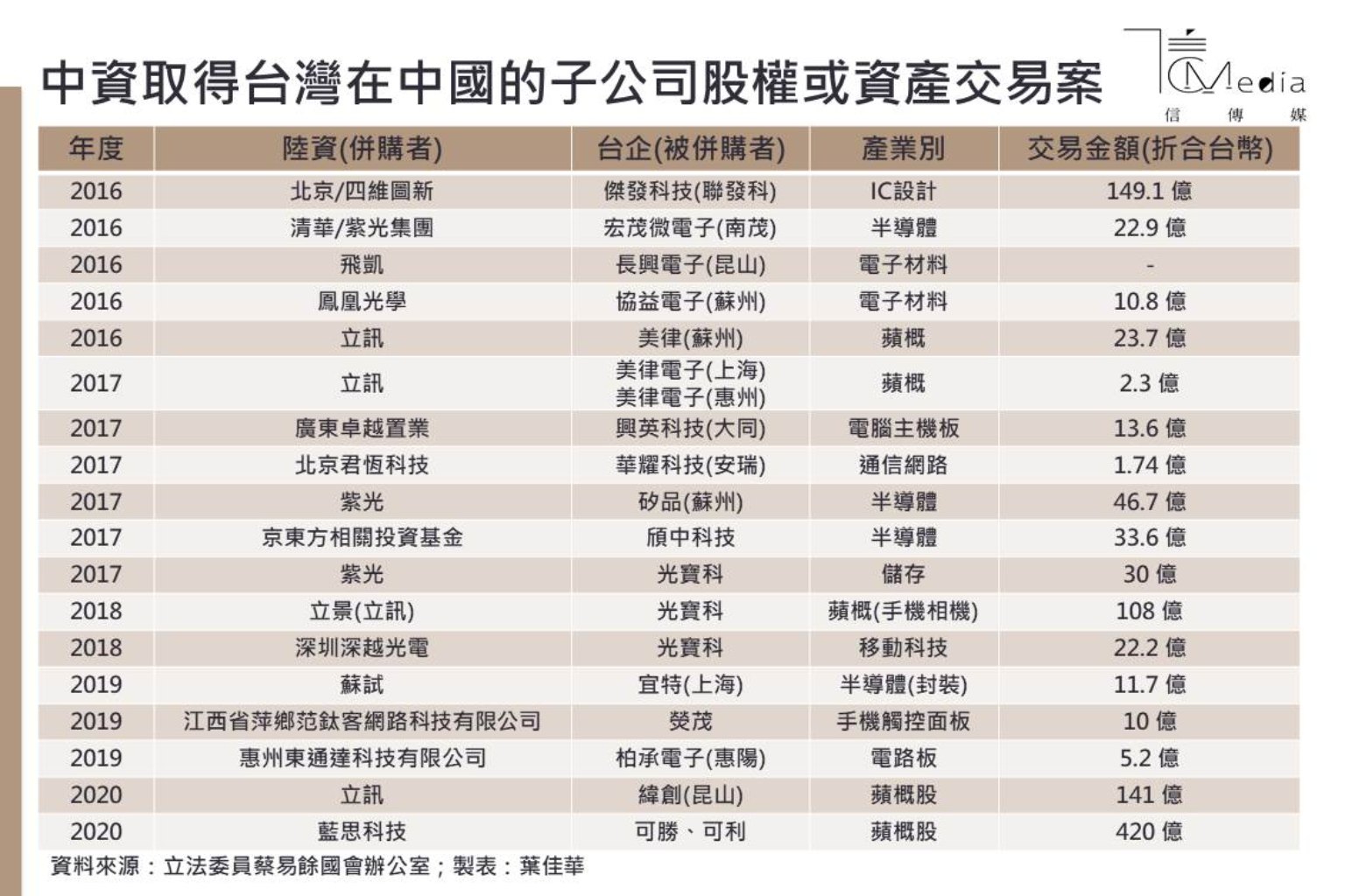 根據民進黨立法委員蔡易餘國會辦公室統計,從2016年以來中資取得台企在中國子公司的股權或是資產交易,累計已有超過20家台企、金額超過千億元交易。其中,中資(或陸資併購者)對象就包括了四維圖新、紫光集團以及立訊等廠商。