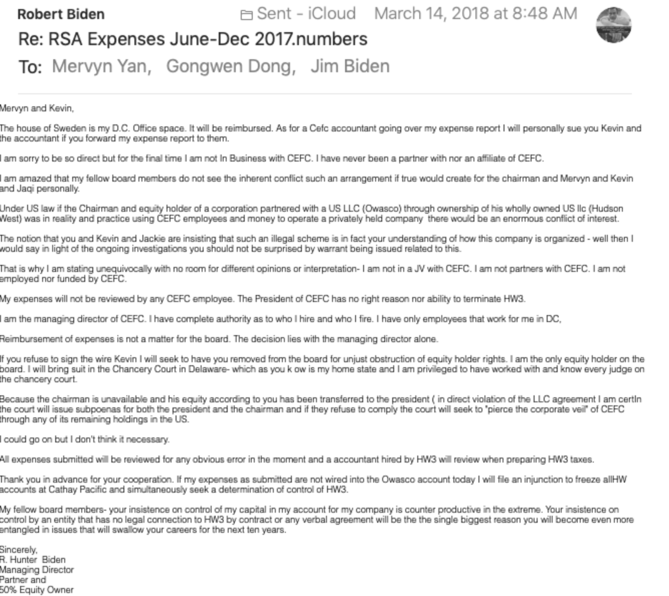 電郵顯示杭特與嚴、董兩人在報銷費用上有糾紛。杭特在信中警告,報銷費用不是董事會的事,決定權完全在執行董事手裡,如果對方拒絕銷帳,他將以不公平妨礙股東權益爲由,將對方趕出董事會。