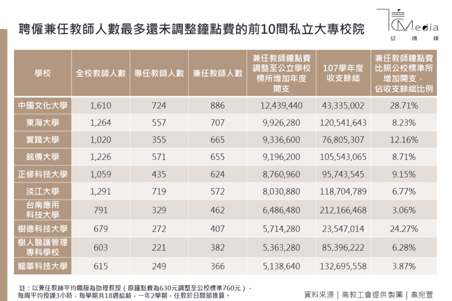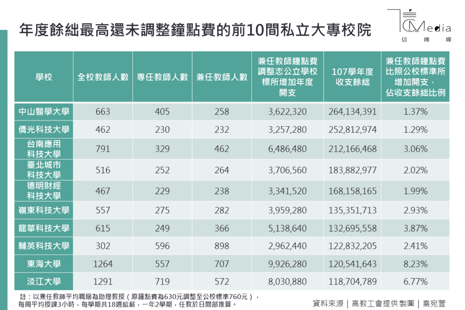 高教工會統計,107學年度餘絀最高前10所私立大專校院,若幫兼任教師加薪至與公校標準,所需負擔之開銷也僅佔其餘絀1.29%至8.23%,這麼微乎其微的數字,根本不會對學校的財務狀況發生任何問題。