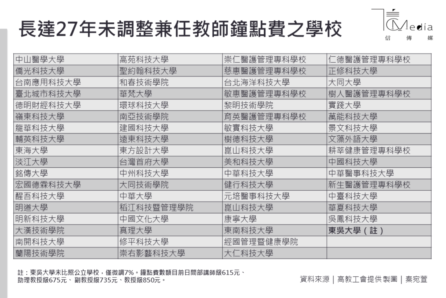 高教工會調查全台104間私立大專校中,僅34所私校將鐘點費調整至公校標準,其餘70所高達7成的私立大學仍然維持以27年前、1993年的鐘點費標準聘僱兼任教師,其中還包括中國文化大學、銘傳大學、淡江大學、東海大學等知名老牌私校。