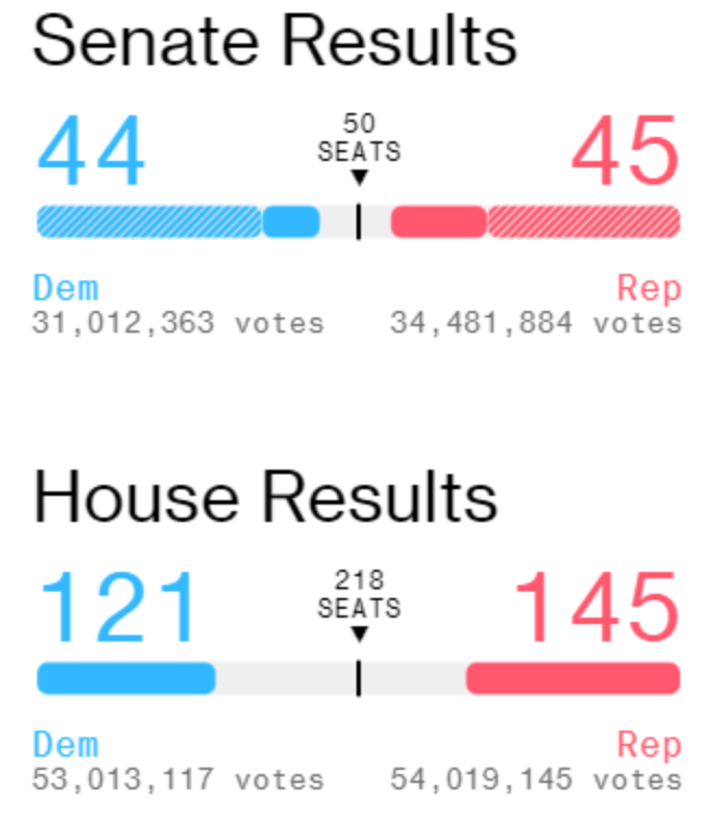 目前共和黨和民主黨在參議院的席次平分秋色,都是43,而眾議院方面,共和黨拿下145席,暫時領先民主黨的121席。