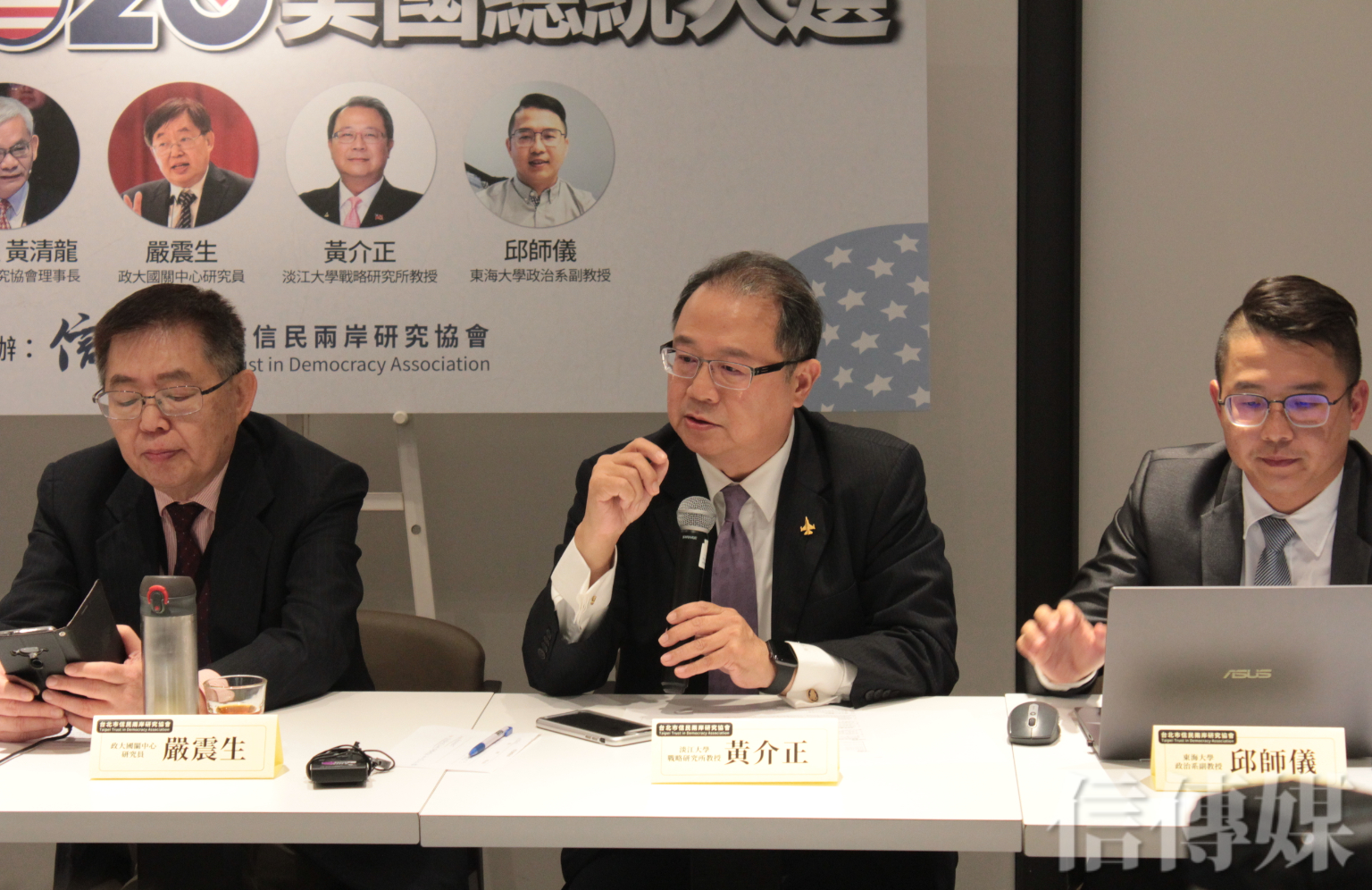 台北市信民兩岸研究協會今天舉拜全台最早的一場美國總統大選學術研討會,邀請到政治大學國關中心教授嚴震生、淡江大學戰略研究所教授黃介正、東海大學政治系副教授邱師儀,並由協會理事長黃清龍主持。