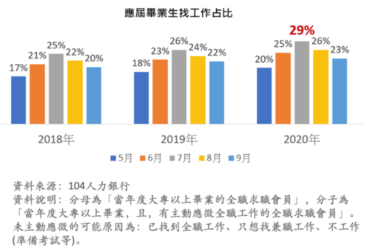 根據104人力銀行9月調查,今年應屆畢業生與過往一樣,多有不知道自己適合甚麼工作(44.6%)、所學與想從事的工作無關難入門(32.5%)、不知道挑哪家公司(23.9%)等問題,不過,今年還多了疫情因素,有66.1%受訪者表示求職受疫情影響。