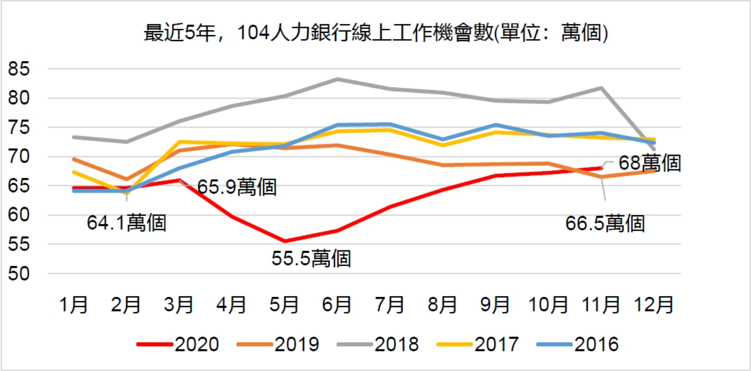 有別於往年徵才高峰落在4到8月,但今年受疫情影響,年度高峰反而成為低谷,根據104人力銀行資料庫,工作數在5月降到55.5萬個的低點,6月起緩步回升,11月回到68萬個的今年高峰,相較去年同期多了1.6萬個工作機會。