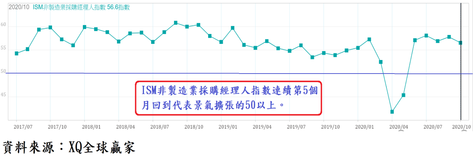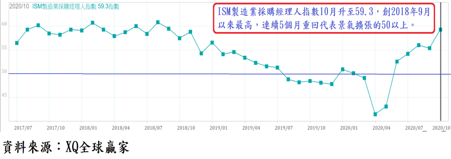 ISM製造業採購經理人指數10月躍升至59.3,創2018年9月以來最高,連續5個月重回代表景氣擴張的50以上,且上升趨勢相當明顯,顯示美國製造業景氣自3月迅速萎縮呈現衰退狀態,6月起已重回擴張軌道。