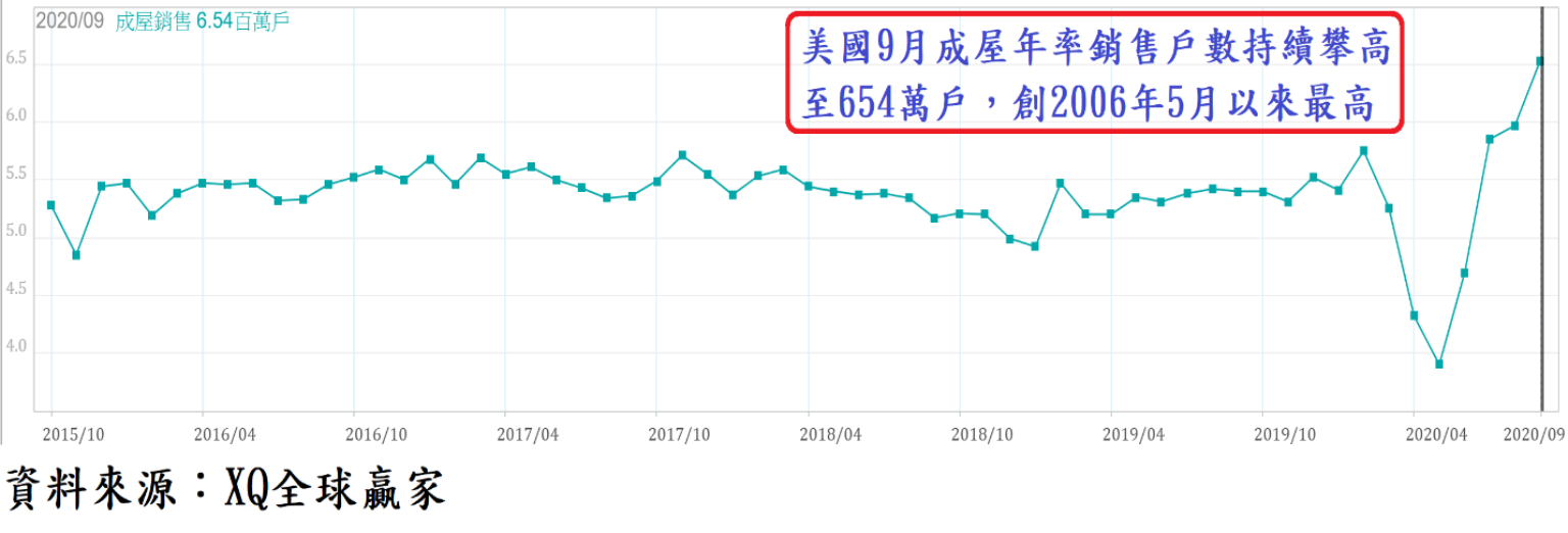 美國9月成屋年率銷售戶數持續攀高至654萬戶,創2006年5月以來最高,年增率達20.89%、連續3個月正成長,創2011年7月以來最高,受惠長期貸款利率續創新低,美國房市景氣甚至已超越疫情爆發前景氣水準。