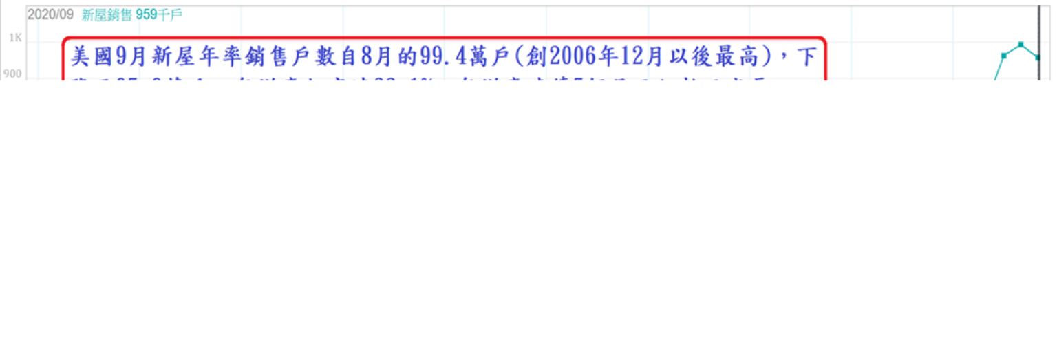美國9月新屋年率銷售戶數自8月的99.4萬戶(創2006年12月以後最高),下降至95.9萬戶,年增率仍高達32.1%,年增率連續5個月兩位數正成長,顯示美國新屋市場自5月以來明顯復甦趨勢尚未改變,此與成屋市場價量齊揚的走勢幾乎完全吻合,顯示美國房市持續維持榮面,幾乎已完全回到武漢肺炎爆發前的擴張向榮軌道。
