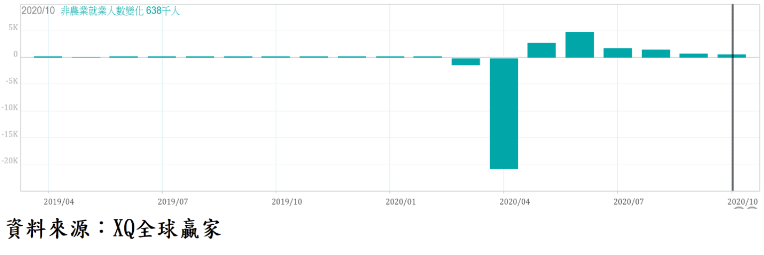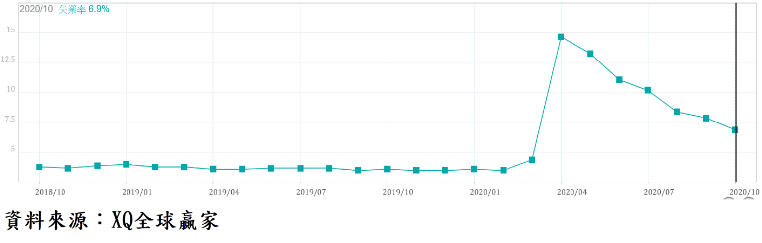 10月非農業新增就業人口63.8萬人,失業率從9月的7.9%下降至6.9%,連續6個月下降。過去5個月新增非農業就業人口合計為1,205.5萬人,仍僅及3月、4月的減少人數合計數2216萬人的54.4%,而武漢肺炎爆發前的2月失業率為3.5%的50年低點,美國就業市場雖已走過疫情爆發後的最低迷期,且持續復甦之中,但因部分經濟消費行為模式改變,致仍遲遲無法恢復正常水平。