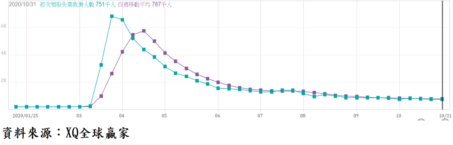 截至10月31日的美國單周初領失業救濟金人數下降至75.1萬人,為連續第3周下降並創3月以來單周最低;首次申請失業救濟金人數四周移動平均下降至78.7萬人,創4月以來最低。無論單周或四周平均值,均朝向正面發展,但相較疫情爆發前的30萬人以下水平,仍有一段不小距離。