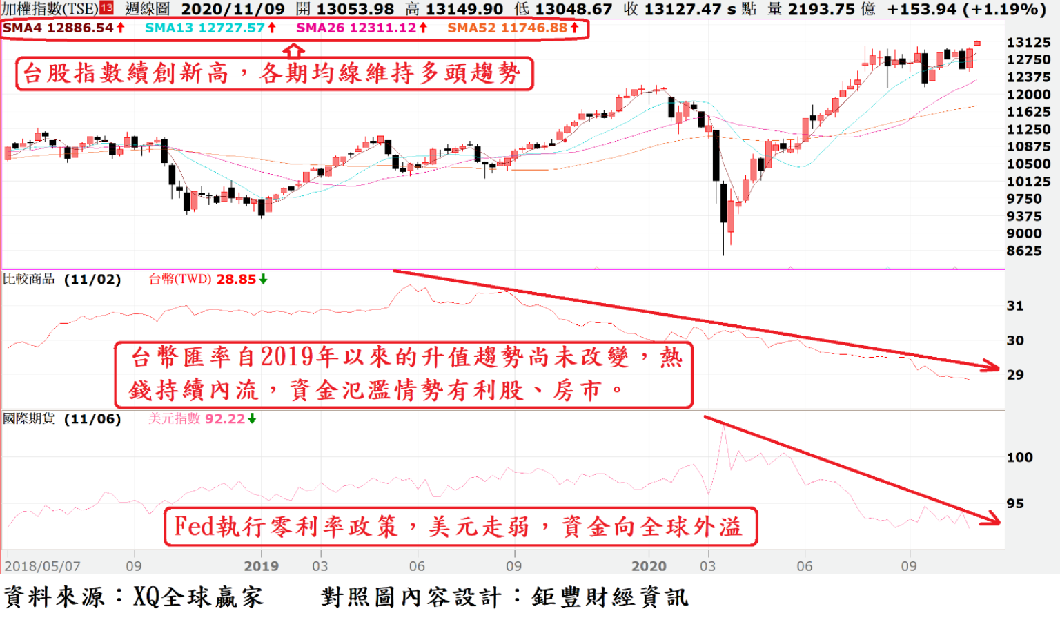 經濟基本面向榮,資金面維持極度寬鬆狀態,均不構成美股走空的客觀條件。資金面的極度寬鬆不僅有利美股多頭,亦外溢至其他國家,台幣匯率亦受此影響而走強,支撐台股資金面不墜。