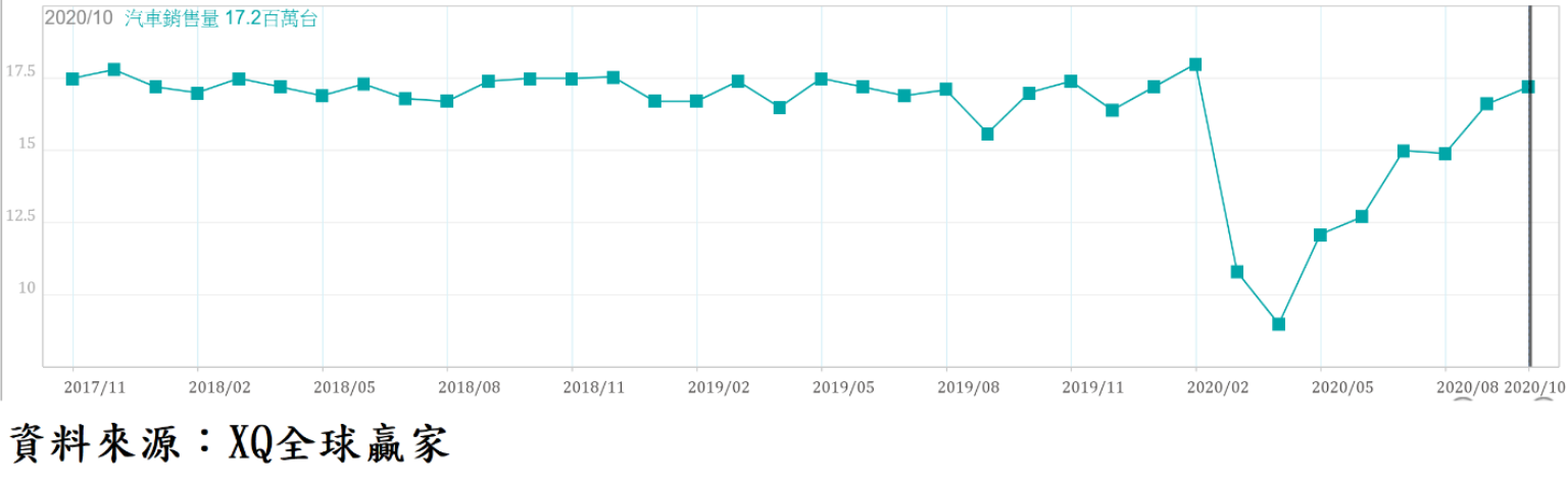 10月汽車年率銷售數量攀高至1720萬輛,創近8個月最高點,單月年增率經連續6個月負成長後,連續兩個月轉為正成長,年增達1.18%。製造業經濟活動重回擴張軌道,加上貸款利率創歷史新低,均有助於汽車銷售量的回升。在總體經濟於第四季可望持續復甦下,汽車業景氣有機會回到疫情爆發前的擴張狀態。