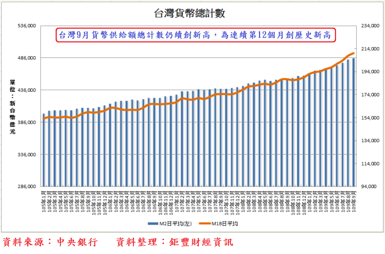 台灣9月國內貨幣供給額總計數仍續創新高,為連續第12個月創歷史新高,預期將於11月下旬公告的10月貨幣供給額總計數仍將續創新高。央行公布10月底外匯存底餘額增至5,012.41億美元,續創歷史新高紀錄,月增16.43億美元,突破5000億美元大關。