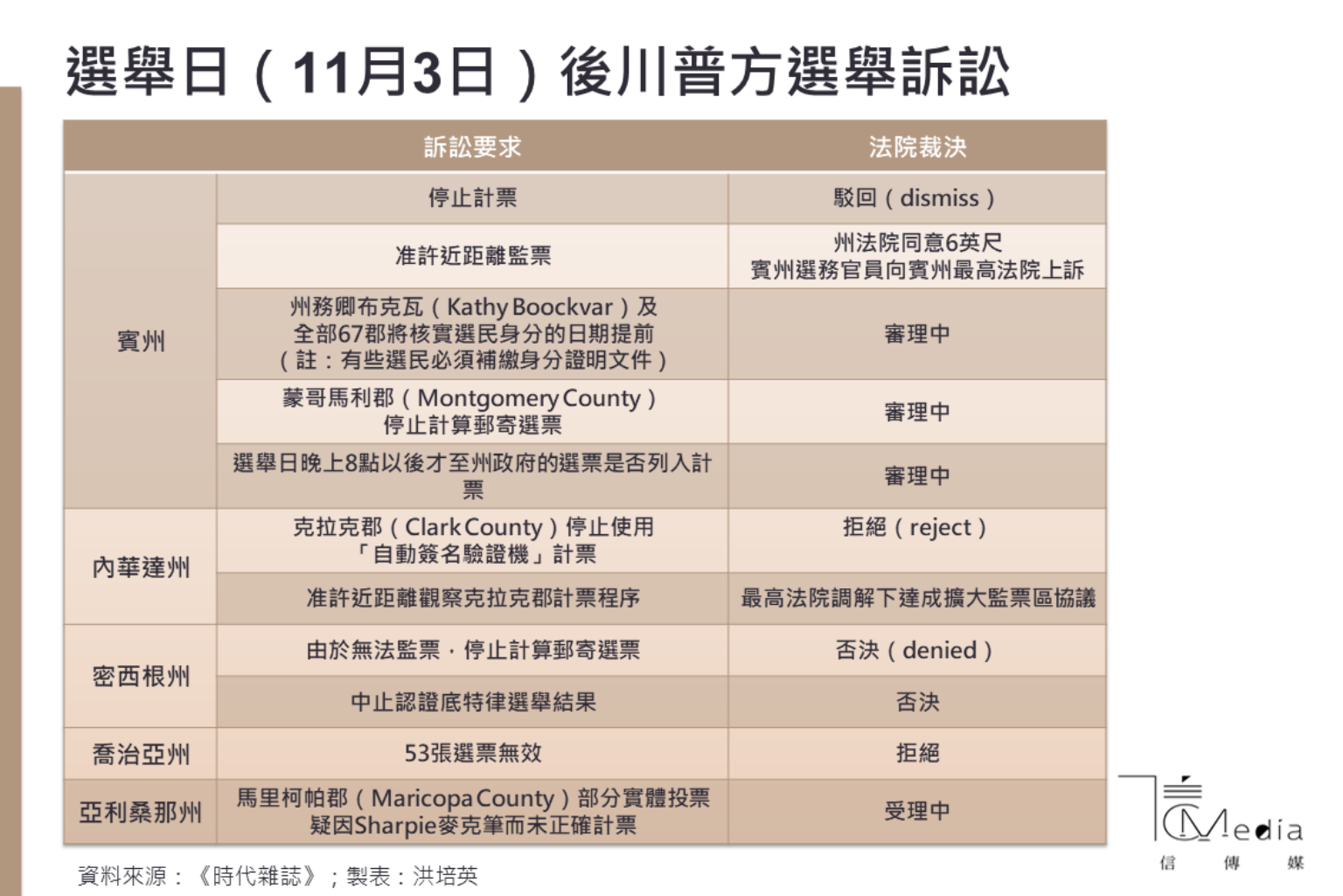 根據《時代雜誌》,11月3日後川普陣營在雙方差距些微的賓州、內華達州、喬治亞州和密西根州提起至少11件選舉訴訟,主要是試圖暫停計票程序和宣稱部分選票無效。