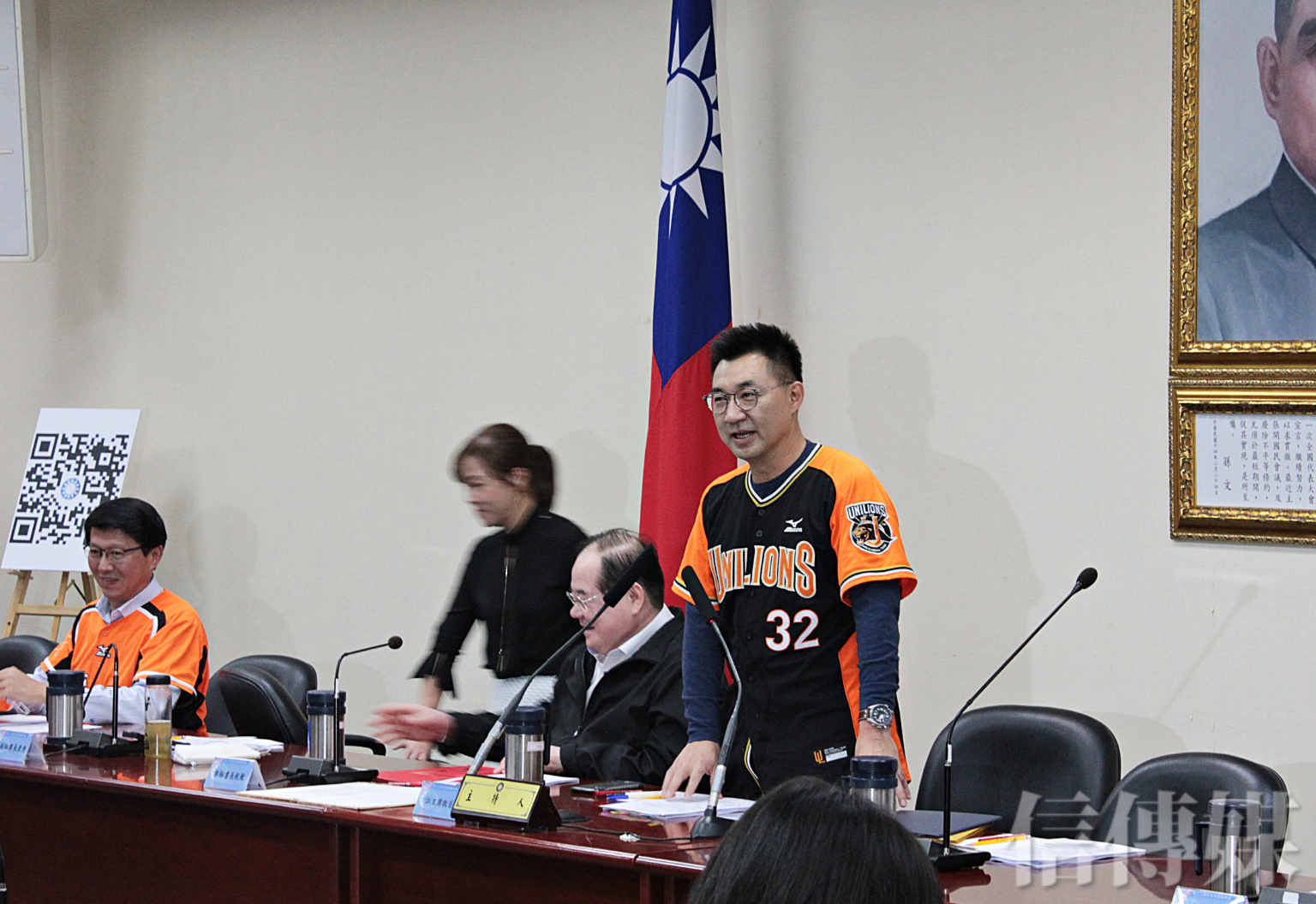 國民黨今(11)日舉行中常會,黨主席江啟臣因打賭輸給副秘書長謝龍介,遂公開換上統一獅橘色戰袍,並全程穿著主持中常會。出身台中的江啟臣笑說,自己仍舊支持主場在台中的中信兄弟,但既然打賭輸給支持台南統一獅的謝龍介,只好「願賭服輸」。