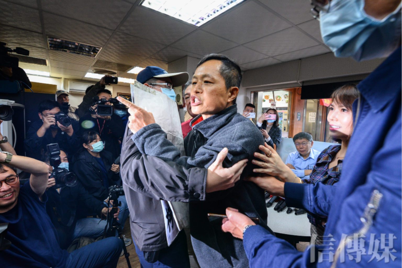 未料,正當柯文哲正字享用牛肉麵津津有味時,台灣國主任陳峻涵佯裝成顧客上前要簽名,卻突然在柯文哲面前大喊「柯文哲不配新聞自由」,場面一度混亂,最後由保鑣架離,才回復了現場秩序。