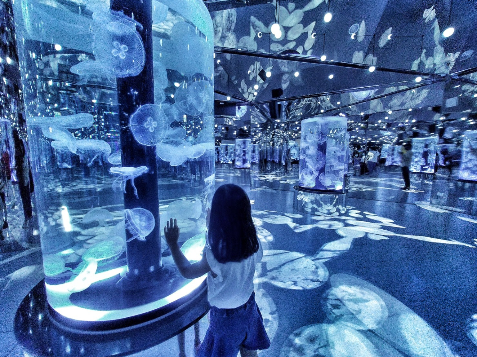 無邊鏡面創造出的奇幻氛圍,圓柱裡全是水母,透過各式彩色光灑在透明的水母上,如萬花筒般的樣貌繽紛又奇幻。七彩霓虹的燈光下的水母可以想像成為各種東西,捏捏你覺得水母很像果凍,我覺得像是不同顏色的花瓣一樣美麗。