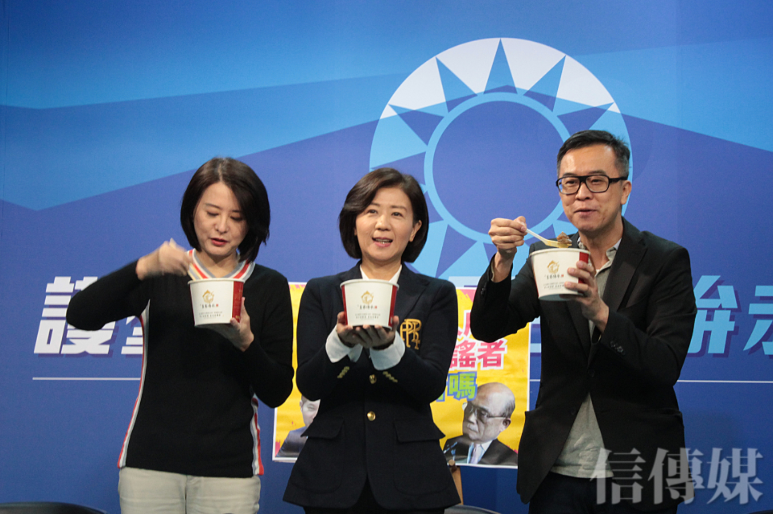 國民黨今天也繼續接力吃牛肉麵,黨中央上午召開記者會時,文傳會副主委黃子哲帶了好幾碗牛肉麵來到現場,與文傳會主委王育敏、副主委王鴻薇開心大啖牛肉麵。
