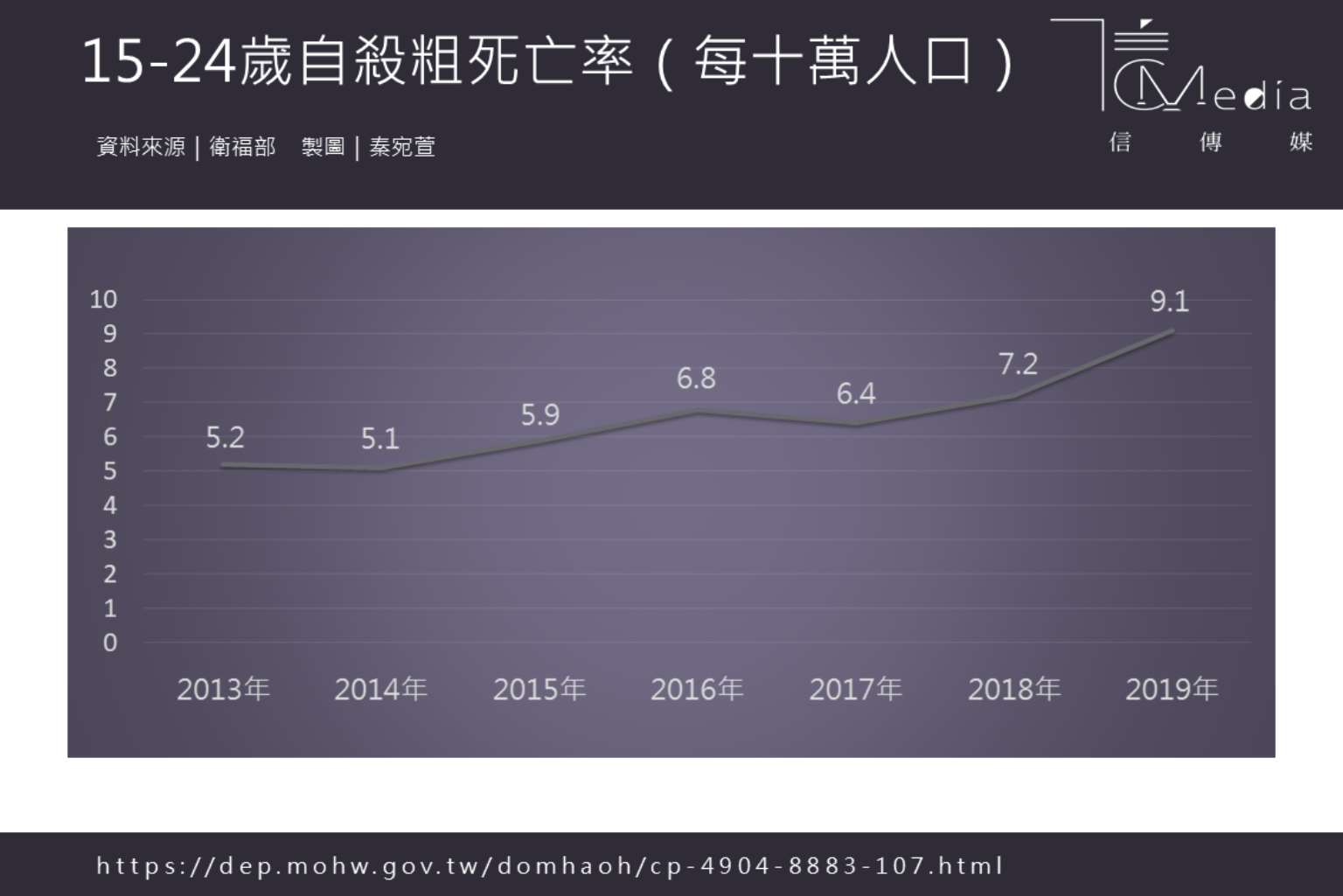 值得注意的是,若放大到全台灣,衛福部統計,台灣2019年的自殺死亡率和過往3年相比隨然持平,但若細分至不同年齡層,會發現14至25歲的自殺死亡人數唯一增加的年齡級距,而自殺也是14至25歲的青少年死亡原因排名第二。