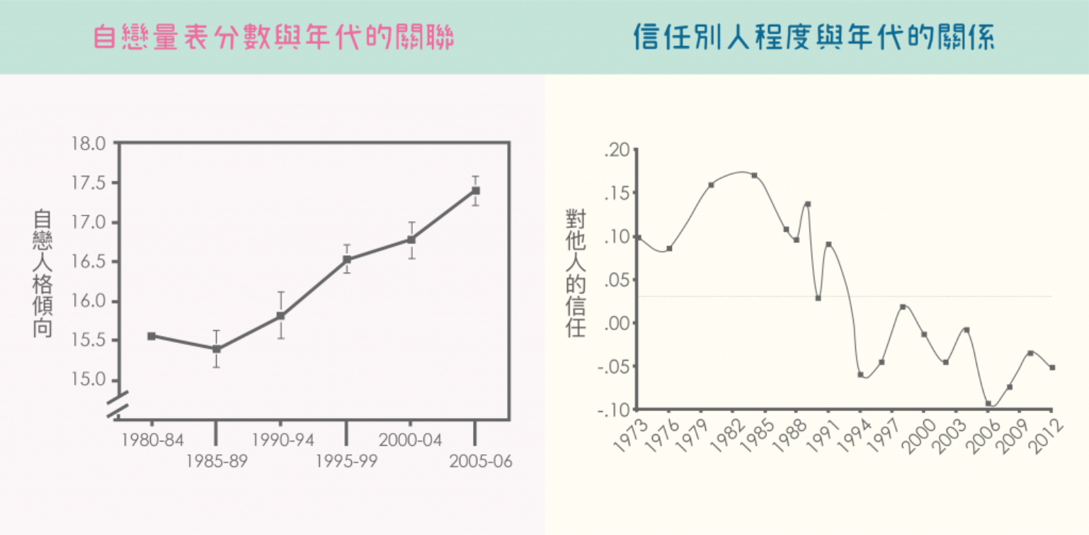 根據上面這張圖表,可以看見在美國社會中,隨著時代演進,自戀傾向也愈來愈高。另一方面,當人們過於著重自我、執著於自我時,對於別人的信任程度也大幅下降。你不相信我、我也質疑你,社交關係將變得緊繃脆弱,若人不和,許多難題也接踵而至。