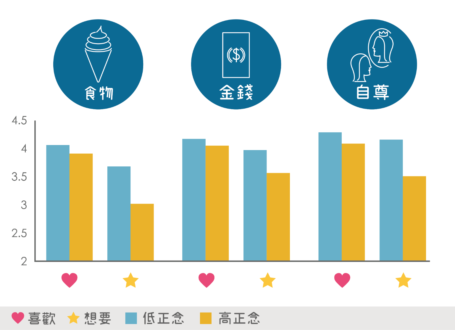 研究結果發現,無論是高正念或低正念的受試者,都呈現喜歡食物、喜歡金錢、喜歡自尊的高度傾向,但若論「想不想要」,高正念的受試者就沒那麼執著於一定要到手。