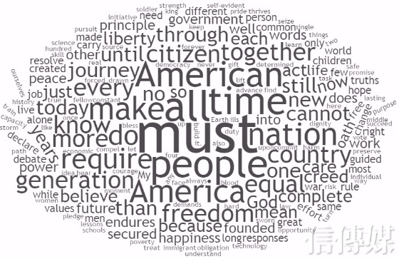 美國第45屆總統川普就職演說出爐,藉由文字雲的字頻分析發現,他果真是個愛國主義者,在他的演講稿中,和國家有關的「America」、「American」、「nation」、「Country」合計就有57次,「People」提及的次數是低於「Country」,但在歐巴馬2013年就職演說中,強調的是「People」和「Freedom」等和平主義字眼。