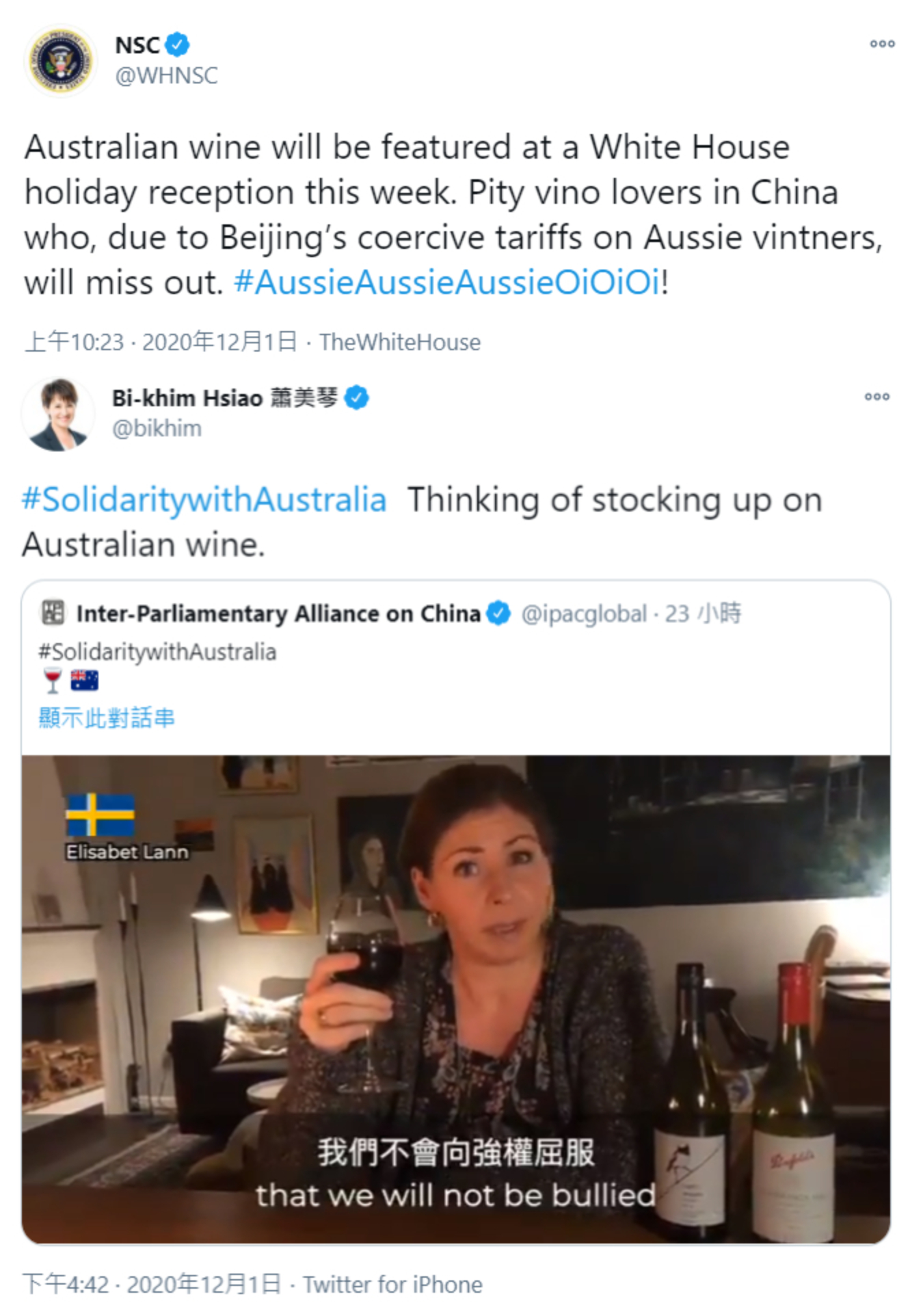 就連美國國家安全會議( US National Security Council )都參一咖,在推特指白宮本週將以澳洲紅酒接待賓客,還不忘表示「為中國紅酒愛好者深表遺憾」。