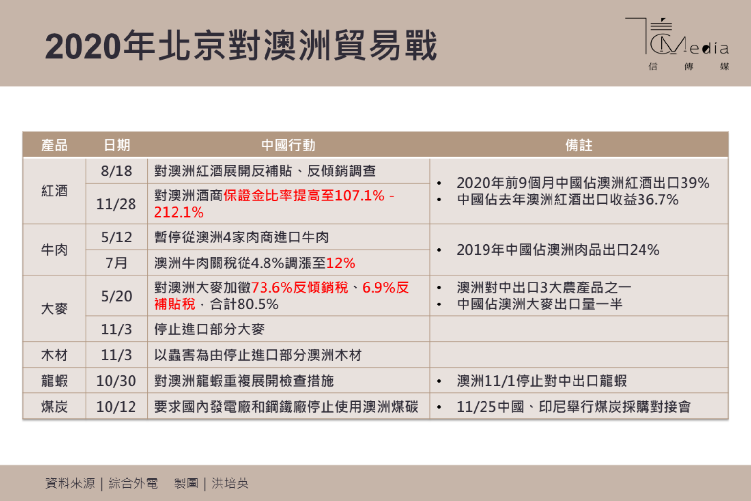 澳中關係自今年5月開始急遽惡化,11月27日北京宣布對澳洲紅酒課徵200%以上重稅,30日中國外交部發言人趙立堅在推特轉發澳洲軍人對阿富汗兒童割喉插圖,使澳中衝突逼近燃點。