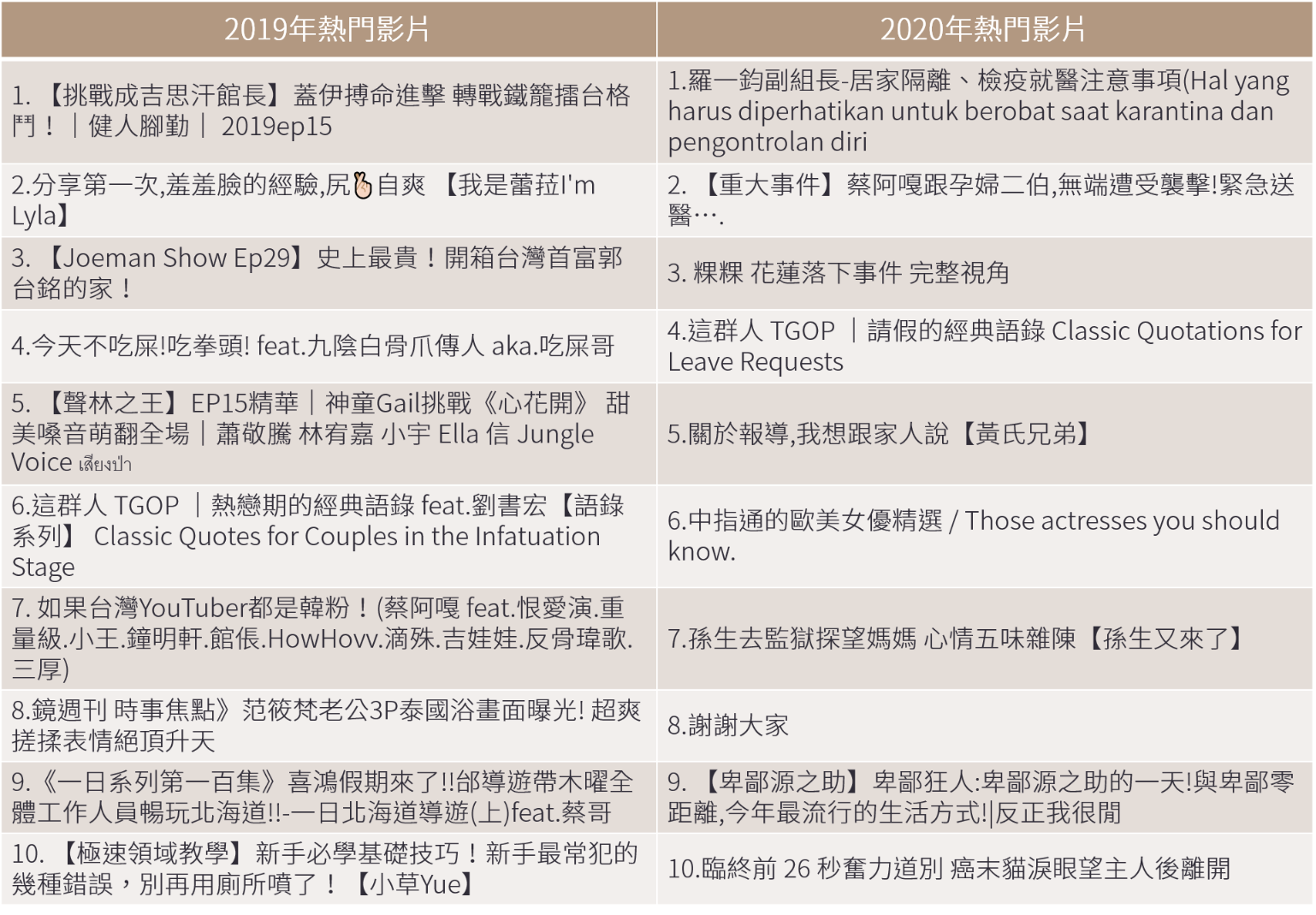 今年的熱門榜單跟去年相比,可以看到創作者個人生活、隱私的內容,包含蔡阿嘎夫婦遭襲擊、狠愛演頻道解散、黃氏兄弟被爆料報導等等事件,多與社會時事案件有關係,同時比起去年都是較輕鬆或甚至有些戲謔的內容,今年的前10名影片題材都相較沉重一些。