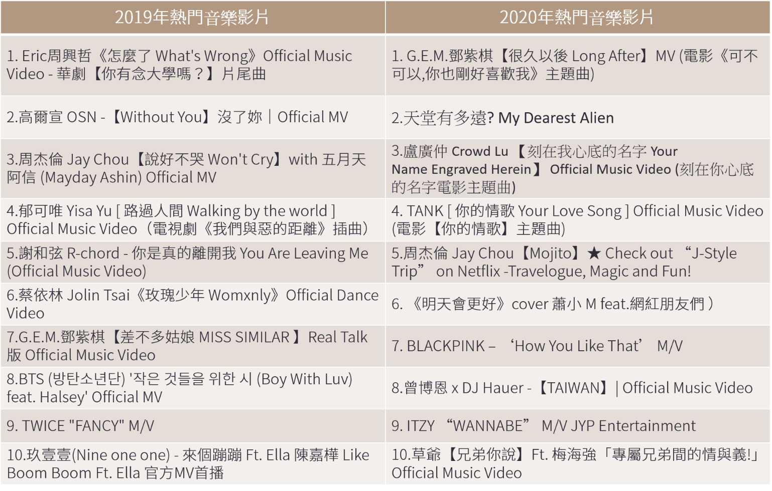 「熱門音樂影片」榜單中涵蓋多元曲風和語言類型的影片,兩個年度冠軍都是影視劇主題曲,而今年度的第二名由綜藝天王吳宗憲為了9月份離開的小鬼黃鴻升創作的「天堂有多遠」拿下,足以看見此事件對於Youtube使用者來說是相當大的事件。
