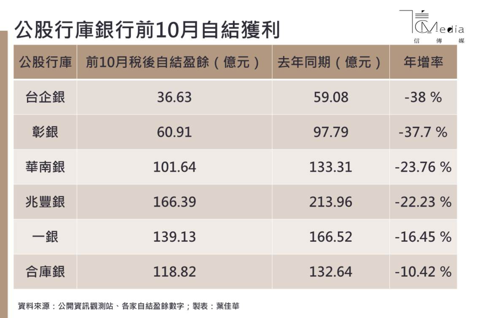 攤開公股行庫銀行前10月自結獲利表現,包括台企銀、彰銀、華南銀、兆豐銀、一銀、合庫銀等獲利皆比去年同期下滑,尤其台企銀以及彰銀衰退幅度更超過3成之上。