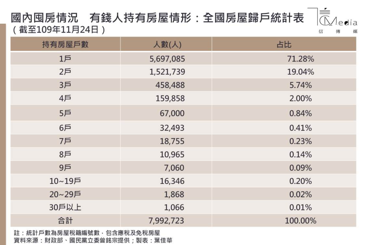 根據財政部全國房屋歸戶統計,截至11月底為止,持有一戶的自然人為569萬7085人,占整體持有房屋自然人數的7成;而持有2戶者則有152萬人左右,累計持有1~2戶的自然人約占整體數的9成。