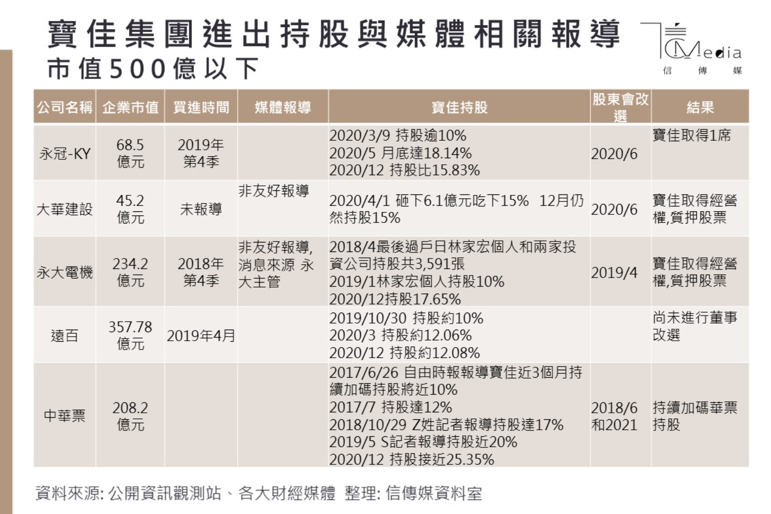 在寶佳對中華票券的持股部分,也可以從兩大財經媒體的特定記者報導中透露的訊息追蹤,從2017年的12%到2020年12月已達25.34%。