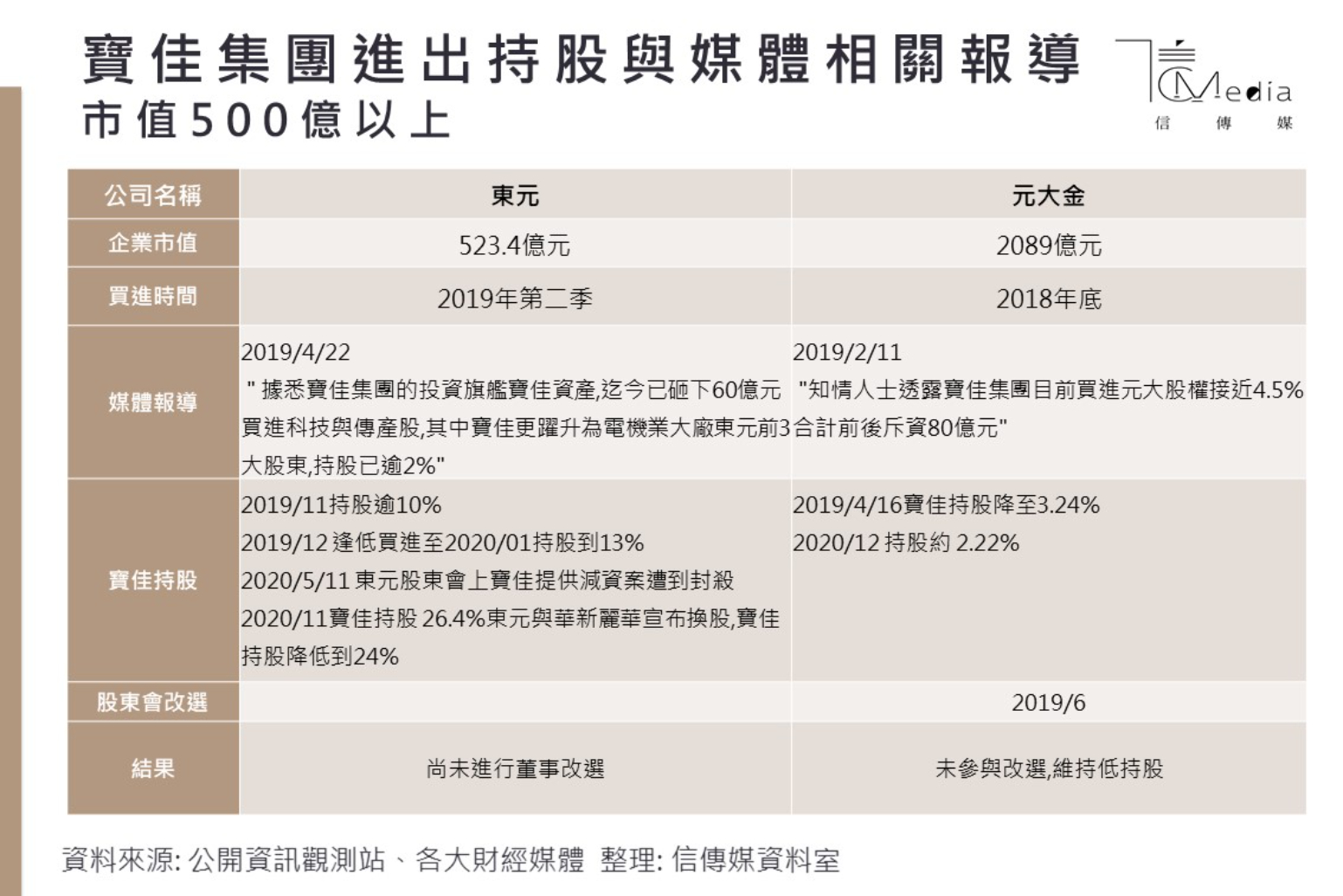 寶佳在2018年底大買元大金之後,也有類似的報導,2019年2月,一篇標題「瞄準董監改選行情」的報導中,引述了「知情人士」的說法,「寶佳集團目前買進的元大金股權已接近4.5%,合計前後斥資近80億元。」