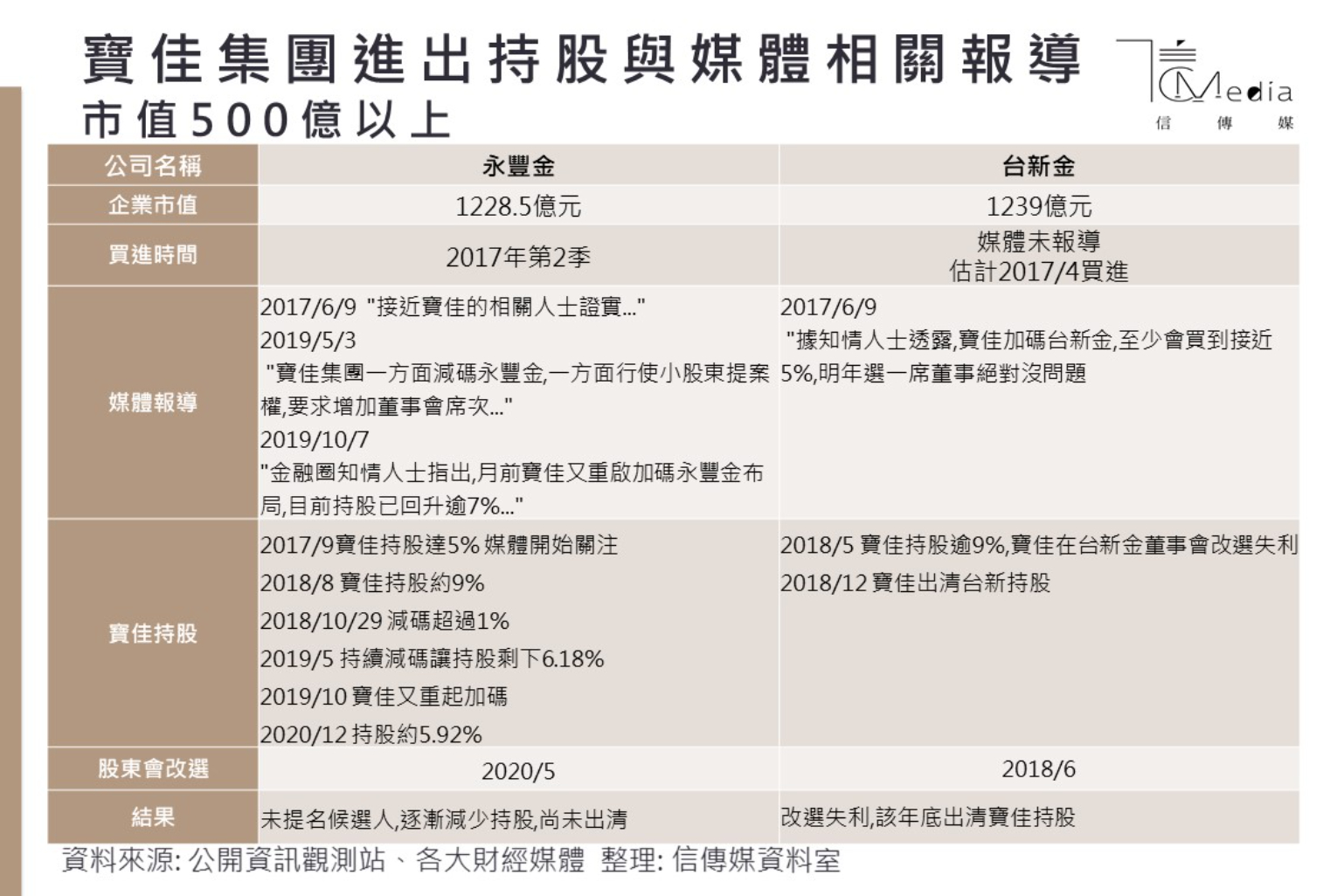 例如,寶佳在2017年第2季開始大買永豐金後,便有媒體報導「接近寶佳機構的相關人士證實…近來的主力除了台新金,永豐金是另一項主要投資」、到了去年10月,又有一篇報導「寶佳又重啟加碼永豐金」。